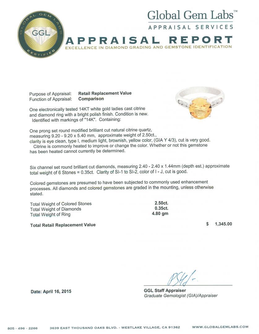 One electronically tested 14KT white gold ladies cast citrine and diamond ring with a bright polish finish. Identified with markings of "14K". Condition is new. Containing: One prong set round modified brilliant cut natural citrine quartz, measuring 9.20 - 9.20 x 5.40 mm, approximate weight of 2.50 ct., clarity is eye clean, type I, medium light, brownish, yellow color, (GIA Y 4/3), cut is very good. Citrine is commonly heated to improve or change the color. Whether or not this gemstone has been heated cannot currently be determined. Six channel set round brilliant cut diamonds, measuring 2.40 - 2.40 x 1.44mm (depth est.) approximate total weight of 6 Stones = 0.35ct. Clarity: SI-1 to SI-2. Color: I - J, Cut is Good. Colored gemstones are presumed to have been subjected to commonly used enhancement processes. All diamonds and colored gemstones are graded in the mounting, unless otherwise stated. Total Weight of Colored Stones 2.50 ct. Total Weight of Diamonds 0.35ct. Total Weight of Ring 4.80 grams. GGL Appraised.