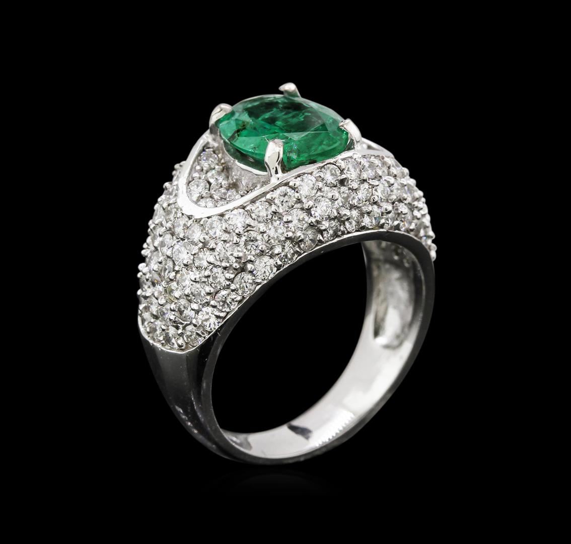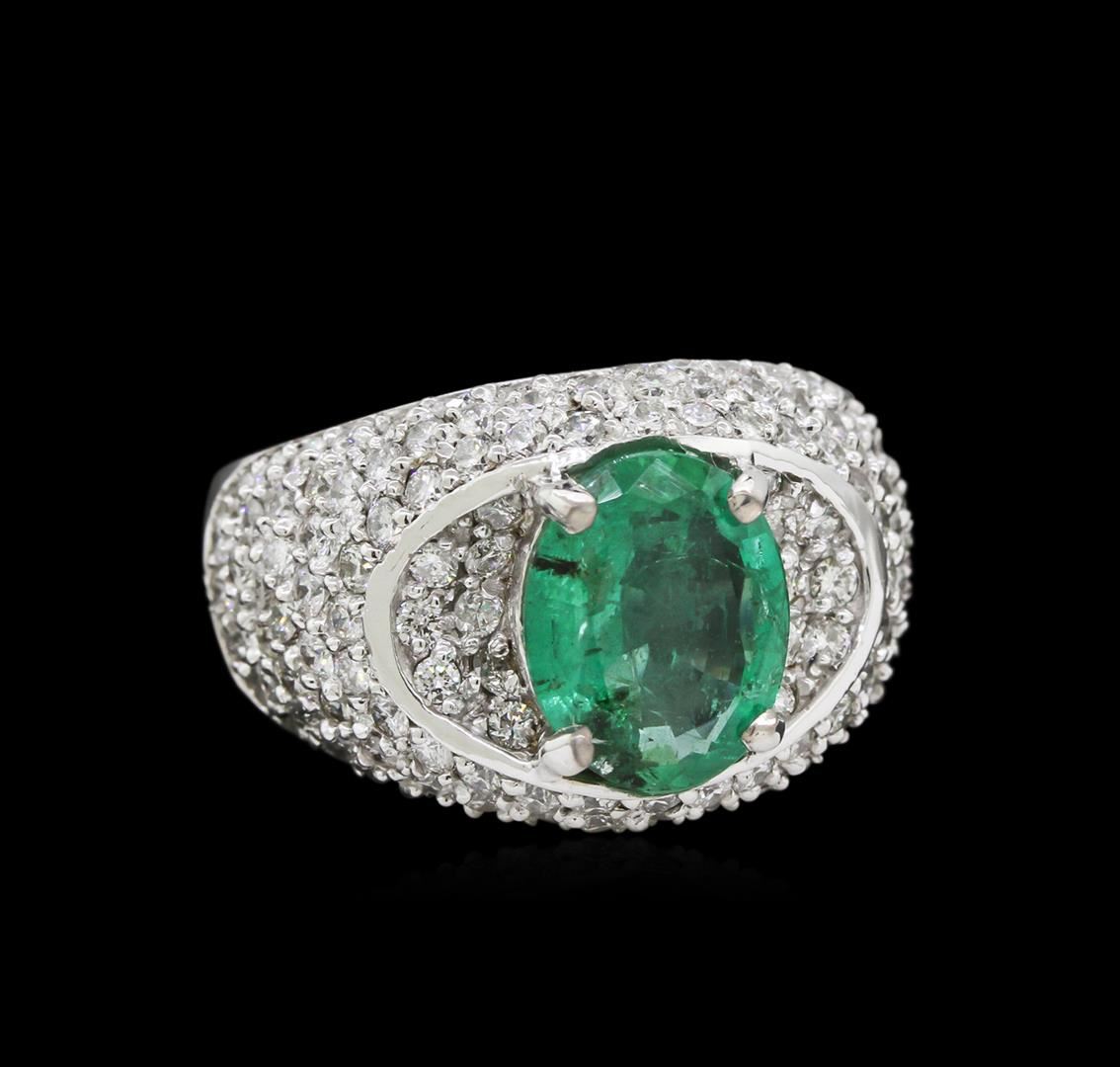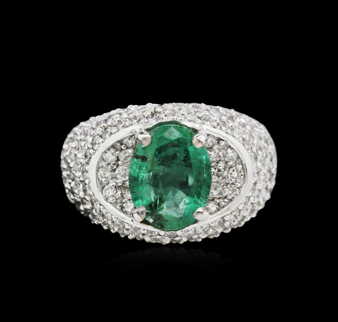 One electronically tested 14KT white gold ladies cast emerald and diamond ring with a bright polish finish. Identified with markings of "K14". Condition is new. Containing: One prong set oval modified brilliant cut natural emerald, measuring 10.50 x 8.00 x 5.20mm, approximate weight of 2.50ct., clarity is moderately included, type III, medium light, very slightly grayish, green color, (GIA G 4/3), cut is good. One Hundred Eight prong set round brilliant cut diamonds, measuring 1.50 - 1.50 x 0.90mm (depth est.) approximate total weight of 108 Stones = 1.33ct. Clarity: SI-1 to I-1. Color: H - I. Colored gemstones are presumed to have been subjected to commonly used enhancement processes. All diamonds and colored gemstones are graded in the mounting, unless otherwise stated. Total Weight of Colored Stones 2.50ct. Total Weight of Diamonds 1.33ct. Total Weight of Ring 8.90 grams. GGL Appraised at $6,770.00.
