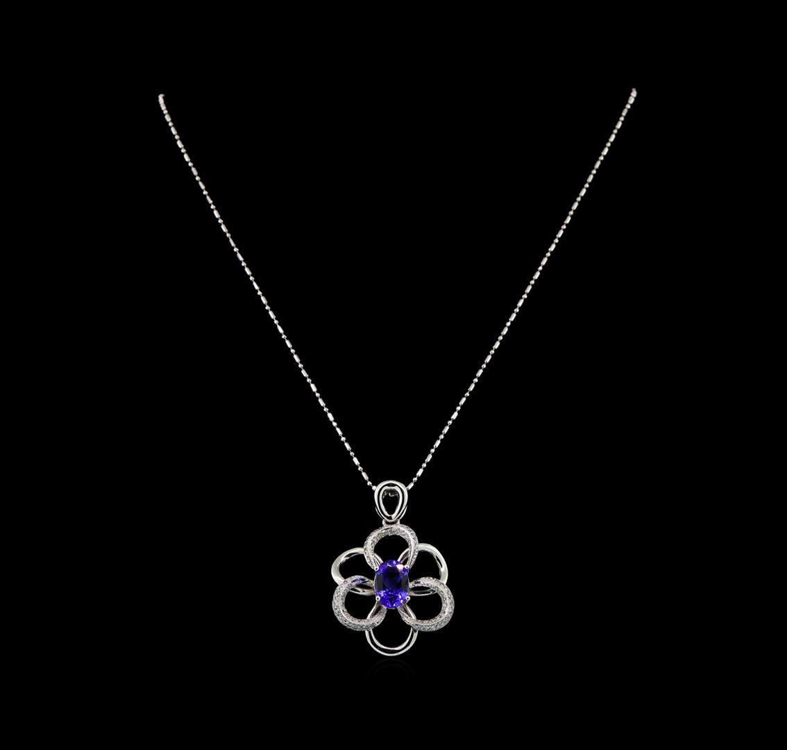 One electronically tested 14KT white gold ladies cast tanzanite and diamond pendant & chain 18.0" long, with a spring ring clasp with a bright polish finish. Identified with markings of "14K". Condition is new. Containing: One prong set oval oval modified brilliant cut natural tanzanite, measuring 10.50 x 6.50 x 4.23mm, approximate weight of 2.50ct., clarity is eye clean, type I, medium light, very slightly grayish, violet color, (GIA V 4/3), cut is good. Seventy-Two prong set round brilliant cut diamonds, measuring 1.30 - 1.30 x 0.78mm (depth est.) approximate total weight of 72 Stones = 0.50ct. Clarity: SI-1 to I-1. Color: H - I, Cut is Good. Colored gemstones are presumed to have been subjected to commonly used enhancement processes. All diamonds and colored gemstones are graded in the mounting, unless otherwise stated. Total Weight of Colored Stones 2.50ct. Total Weight of Diamonds 0.50ct. Total Weight of Pendant & Chain 10.00 grams. GGL Appraised at $4,070.00.
