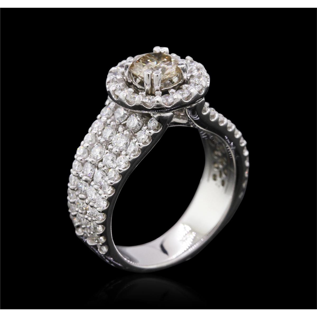 One electronically tested 14KT white gold ladies cast diamond ring with a bright polish finish. The featured diamond is set within a diamond bezel supported by elaborate diamond set shoulders, completed by a four and one-half millimeter wide band. Identified with markings of 14K. Condition is new, good workmanship. Containing: One prong set round brilliant cut diamond, measuring 5.75 - 5.70 x 3.20mm (depth est.), 5.00.%. GTCF approximate weight of 0.77ct with a medium blue fluorescence. Graded in the setting. Clarity: I-1. Depth: 55.9%. Table 62.8%. Ninety-Two prong set round brilliant cut diamonds, measuring 1.80 - 1.60 x 1.02mm (depth est.) approximate total weight of 92 Stones = 1.74ct. Graded in the setting. Clarity: SI-1 to I-1. Color: G - I. Total Weight of Diamonds 2.51ct. Total Weight of Ring 9.08 grams. AIG Appraised at $11,260.00.