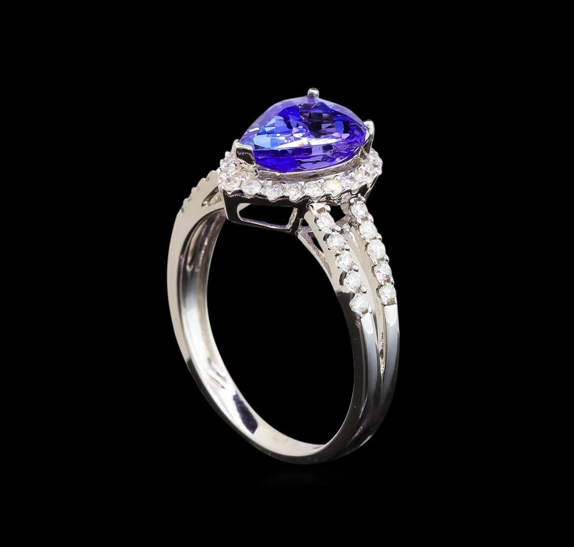 One electronically tested 14KT white gold ladies cast tanzanite and diamond ring with a split shoulder shank with a bright polish finish. Trademark is Orianne. Identified with markings of "14K". Condition is new. Containing: One prong set oval modified brilliant cut natural tanzanite, measuring 10.96 x 6.99 x 4.65mm, approximate weight of 2.51ct., clarity is eye clean, type I, medium light, very slightly grayish, violet color, (GIA V 4/3), cut is good. Forty-Two prong set round brilliant cut diamonds, measuring 1.20 - 1.20 x 0.72mm (depth est.) approximate total weight of 42 Stones = 0.27ct. Clarity: I-1 to I-2. Color: I - J. All diamonds and colored gemstones are graded in the mounting, unless otherwise stated. Colored gemstones are presumed to have been subjected to commonly used enhancement processes.. Total Weight of Colored Stones 2.51ct. Total Weight of Diamonds 0.27ct. Total Weight of Ring 3.00 grams. GGL Appraised at $3,040.00.
