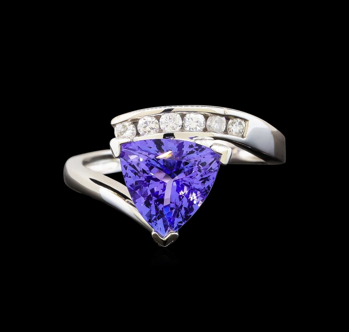 One electronically tested 14KT white gold ladies cast tanzanite and diamond ring with a flat shank with a bright polish finish. Trademark is Orianne. Identified with markings of "14K". Condition is new. Containing: One prong set triangle modified brilliant cut natural tanzanite, measuring 8.61 x 8.43 x 5.73mm, approximate weight of 2.51ct., clarity is eye clean, type I, medium, very slightly grayish, violet color, (GIA V 5/3), cut is good. Six channel set round brilliant cut diamonds, measuring 1.50 - 1.50 x 0.90mm (depth est.) approximate total weight of 6 Stones = 0.07ct. Clarity: SI-2 to I-1. Color: I - J, Cut is Good. All diamonds and colored gemstones are graded in the mounting, unless otherwise stated. Colored gemstones are presumed to have been subjected to commonly used enhancement processes.. Total Weight of Colored Stones 2.51ct. Total Weight of Diamonds 0.07ct. Total Weight of Ring 3.90 grams. GGL Appraised at $2,775.00.