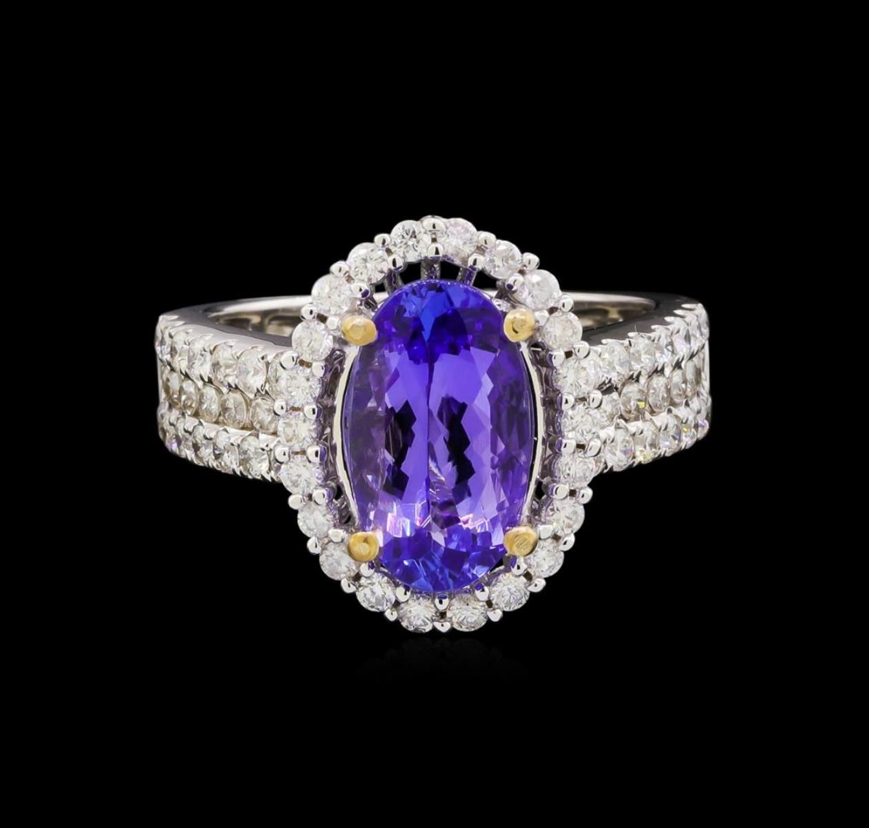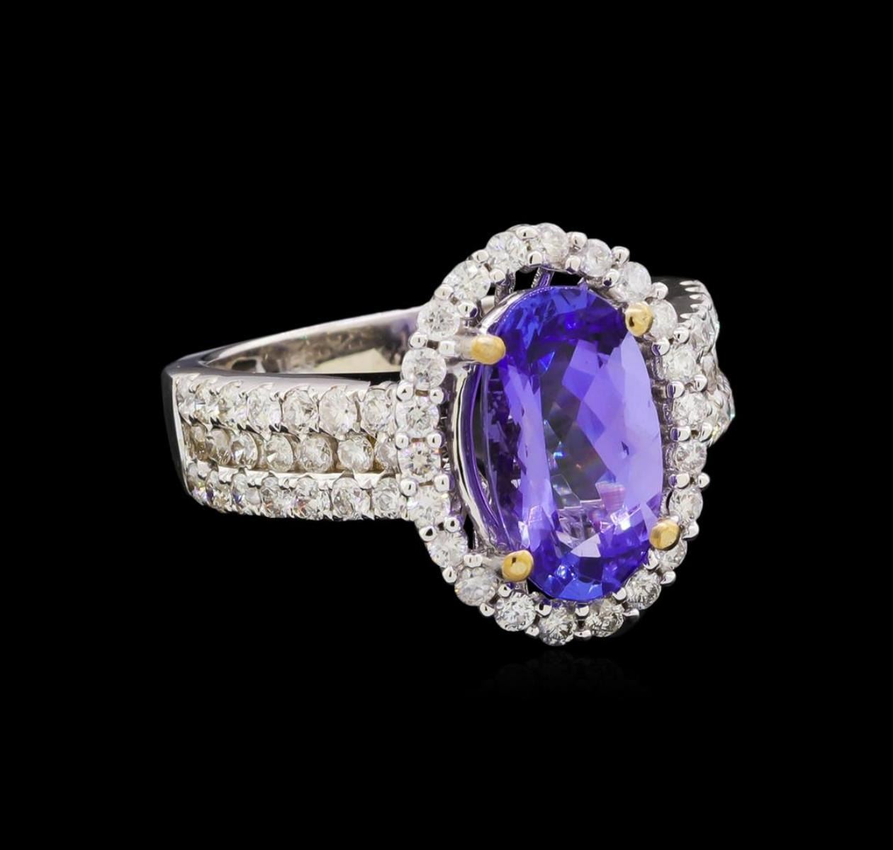 One electronically tested 14KT white gold ladies combination cast & assembled tanzanite and diamond ring with a flat shank with a bright polish finish. Identified with markings of "14K". Condition is new. Containing: One prong set oval modified brilliant cut natural tanzanite, measuring 11.90 x 6.84 x 4.27mm, approximate weight of 2.51ct., clarity is eye clean, type I, medium light, very slightly grayish, violet color, (GIA V 4/3), cut is good. Sixty-Four prong set round brilliant cut diamonds, measuring 1.80 - 1.50 x 0.99mm (depth est.) approximate total weight of 64 Stones = 1.05ct. Clarity: I-1 to I-2. Color: I - J, Cut is Good. Colored gemstones are presumed to have been subjected to commonly used enhancement processes. All diamonds and colored gemstones are graded in the mounting, unless otherwise stated. Total Weight of Colored Stones 2.51ct. Total Weight of Diamonds 1.05ct. Total Weight of Ring 6.20 grams. GGL Appraised.