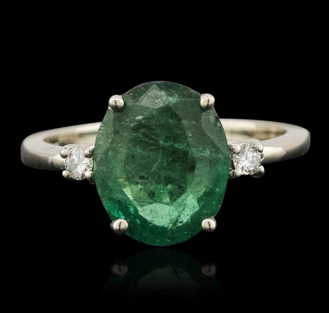 One electronically tested 14KT white gold ladies cast emerald and diamond ring with a bright polish finish. The featured emerald is accented by a single diamond on either side, completed by a two millimeter wide band. Identified with markings of "14K". Condition is new, good workmanship. Containing: One prong set oval mixed cut natural emerald, measuring 11.00 x 8.90 x 4.40mm, 6%. bulge factor, approximate weight of 2.51ct., clarity is heavily included, type III, medium dark, very slightly grayish, very slightly bluish green color, (GIA vslbG 6/3), cut is good. Transmitting light somewhat diffusely, transparent to translucent. Naturally occurring internal & external characteristics are present. Indications of oil residue. Graded in the setting. Two prong set round brilliant cut diamonds, measuring 2.20 - 2.10 x 1.29mm (depth est.) approximate. Total Weight of 2 Stones = 0.08ct. Graded in the setting. Clarity: I-1. Color: G. Total Weight of Colored Stones 2.51ct. Total Weight of Diamonds 0.08ct. Total Weight of Ring 2.72gm. AIG Appraised at $3,615.00.