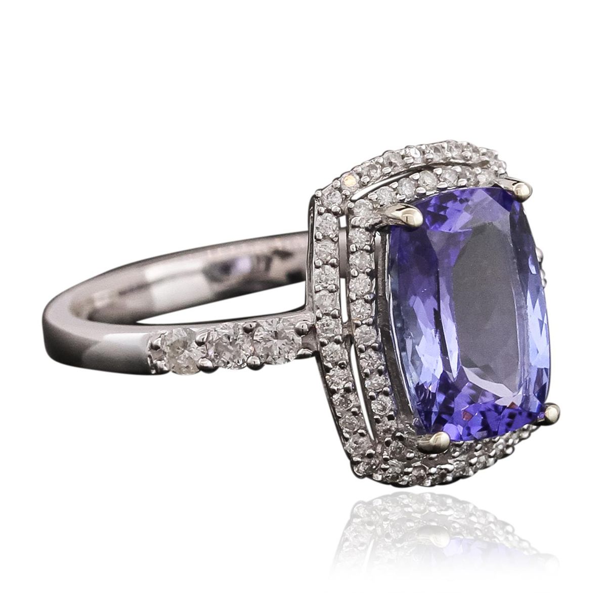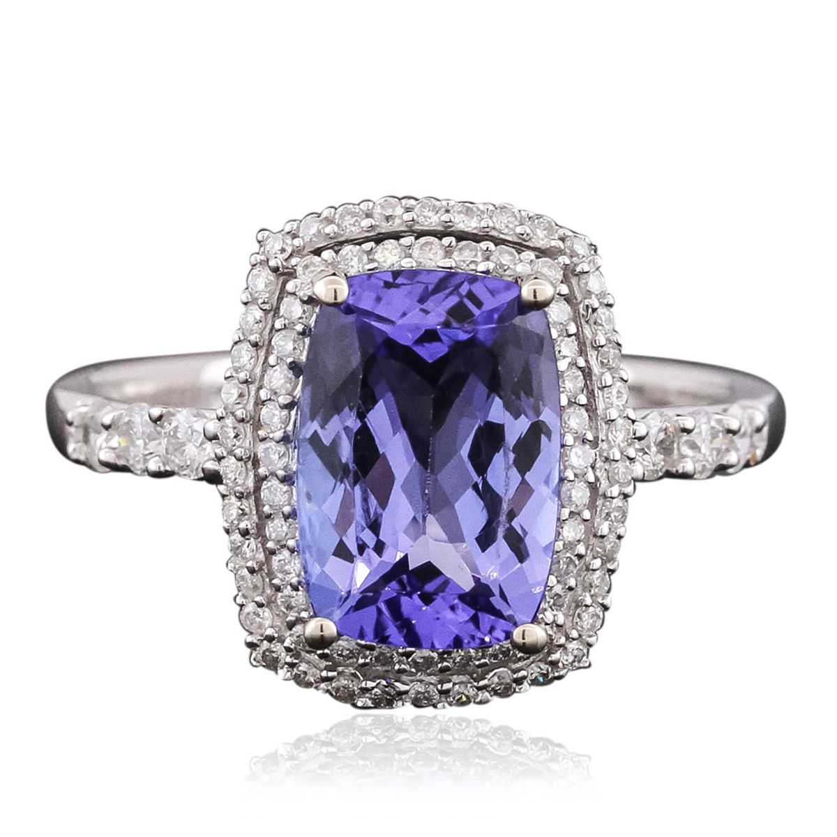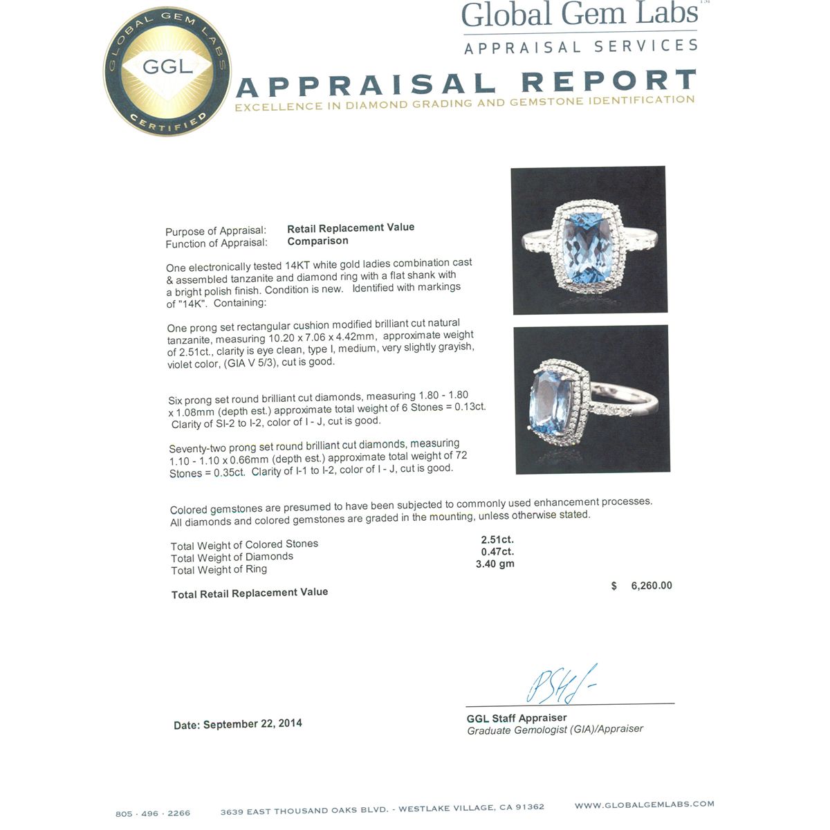 One electronically tested 14KT white gold ladies combination cast & assembled tanzanite and diamond ring with a flat shank with a bright polish finish. Identified with markings of "14K". Condition is new. Containing: One prong set rectangular cushion modified brilliant cut natural tanzanite, measuring 10.20 x 7.06 x 4.42mm, approximate weight of 2.51ct., clarity is eye clean, type I, medium, very slightly grayish, violet color, (GIA V 5/3), cut is good. Six prong set round brilliant cut diamonds, measuring 1.80 - 1.80 x 1.08mm (depth est.) approximate total weight of 6 Stones = 0.13ct. Clarity: SI-2 to I-2. Color: I - J, Cut is Good. Seventy-Two prong set round brilliant cut diamonds, measuring 1.10 - 1.10 x 0.66mm (depth est.) approximate total weight of 72 Stones = 0.35ct. Clarity: I-1 to I-2. Color: I - J, Cut is Good. Colored gemstones are presumed to have been subjected to commonly used enhancement processes. All diamonds and colored gemstones are graded in the mounting, unless otherwise stated. Total Weight of Colored Stones 2.51ct. Total Weight of Diamonds 0.47ct. Total Weight of Ring 3.40 grams. GGL Appraised at $6,260.00.