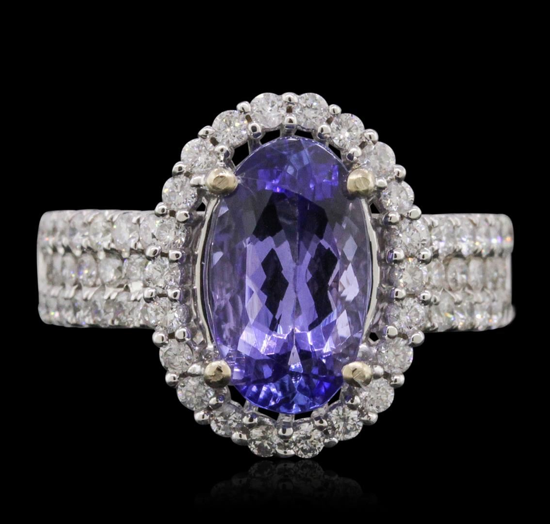 One electronically tested 14KT white gold ladies combination cast & assembled tanzanite and diamond ring with a flat shank with a bright polish finish. Identified with markings of "14K". Condition is new. Containing: One prong set oval modified brilliant cut natural tanzanite, measuring 11.90 x 6.84 x 4.27mm, approximate weight of 2.51ct., clarity is eye clean, type I, medium light, very slightly grayish, violet color, (GIA V 4/3), cut is good. Sixty-Four prong set round brilliant cut diamonds, measuring 1.80 - 1.50 x 0.99mm (depth est.) approximate total weight of 64 Stones = 1.05ct. Clarity: I-1 to I-2. Color: I - J, Cut is Good. Colored gemstones are presumed to have been subjected to commonly used enhancement processes. All diamonds and colored gemstones are graded in the mounting, unless otherwise stated. Total Weight of Colored Stones 2.51ct. Total Weight of Diamonds 1.05ct. Total Weight of Ring 6.20 grams. GGL Appraised at $7,225.00.