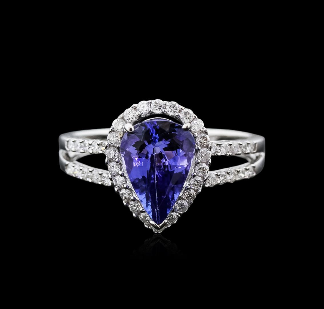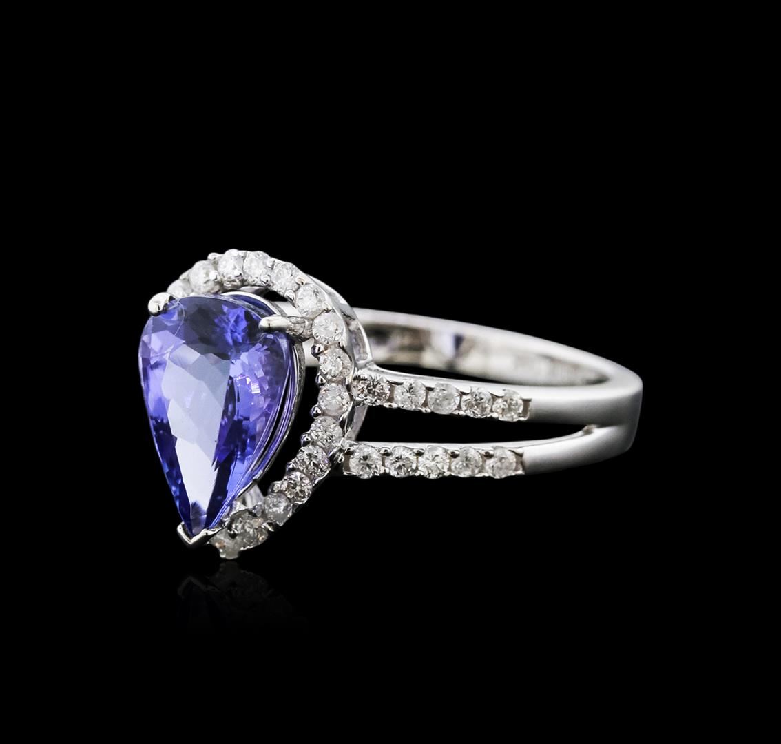 One electronically tested 14KT white gold ladies cast tanzanite and diamond ring with a split shoulder shank with a bright polish finish. Trademark is Orianne. Identified with markings of "14K". Condition is new. Containing: One prong set oval modified brilliant cut natural tanzanite, measuring 10.96 x 6.99 x 4.65mm, approximate weight of 2.51ct., clarity is eye clean, type I, medium light, very slightly grayish, violet color, (GIA V 4/3), cut is good. Forty-Two prong set round brilliant cut diamonds, measuring 1.20 - 1.20 x 0.72mm (depth est.) approximate total weight of 42 Stones = 0.27ct. Clarity: I-1 to I-2. Color: I - J. All diamonds and colored gemstones are graded in the mounting, unless otherwise stated. Colored gemstones are presumed to have been subjected to commonly used enhancement processes.. Total Weight of Colored Stones 2.51ct. Total Weight of Diamonds 0.27ct. Total Weight of Ring 3.00 grams. GGL Appraised at $3,040.00.
