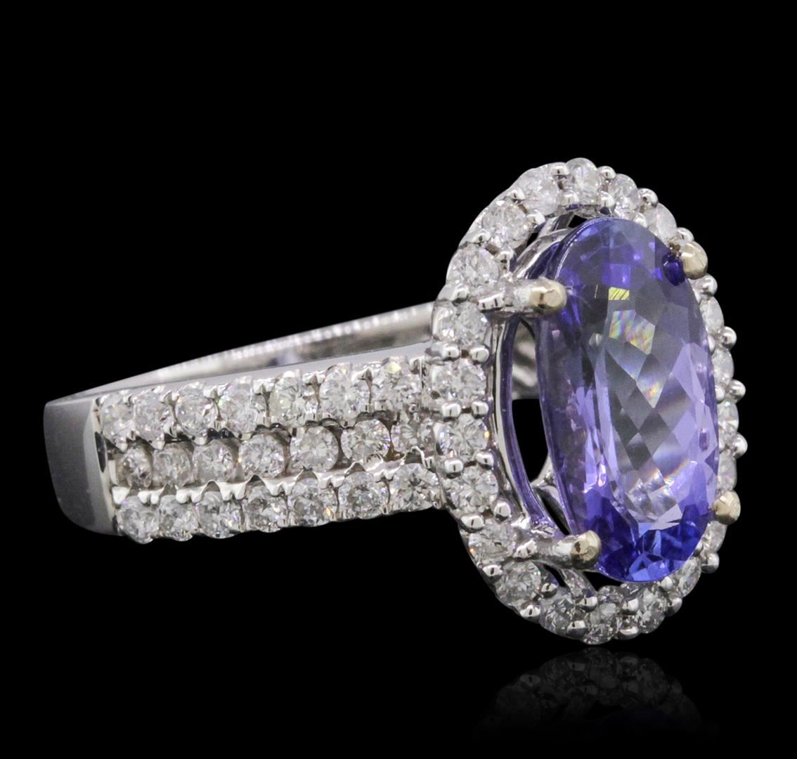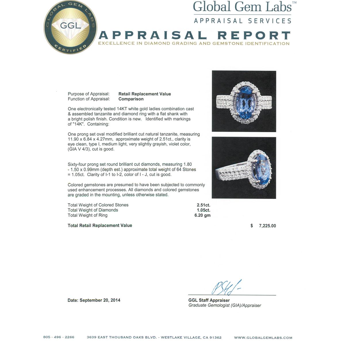 One electronically tested 14KT white gold ladies combination cast & assembled tanzanite and diamond ring with a flat shank with a bright polish finish. Identified with markings of "14K". Condition is new. Containing: One prong set oval modified brilliant cut natural tanzanite, measuring 11.90 x 6.84 x 4.27mm, approximate weight of 2.51ct., clarity is eye clean, type I, medium light, very slightly grayish, violet color, (GIA V 4/3), cut is good. Sixty-Four prong set round brilliant cut diamonds, measuring 1.80 - 1.50 x 0.99mm (depth est.) approximate total weight of 64 Stones = 1.05ct. Clarity: I-1 to I-2. Color: I - J, Cut is Good. Colored gemstones are presumed to have been subjected to commonly used enhancement processes. All diamonds and colored gemstones are graded in the mounting, unless otherwise stated. Total Weight of Colored Stones 2.51ct. Total Weight of Diamonds 1.05ct. Total Weight of Ring 6.20 grams. GGL Appraised at $7,225.00.