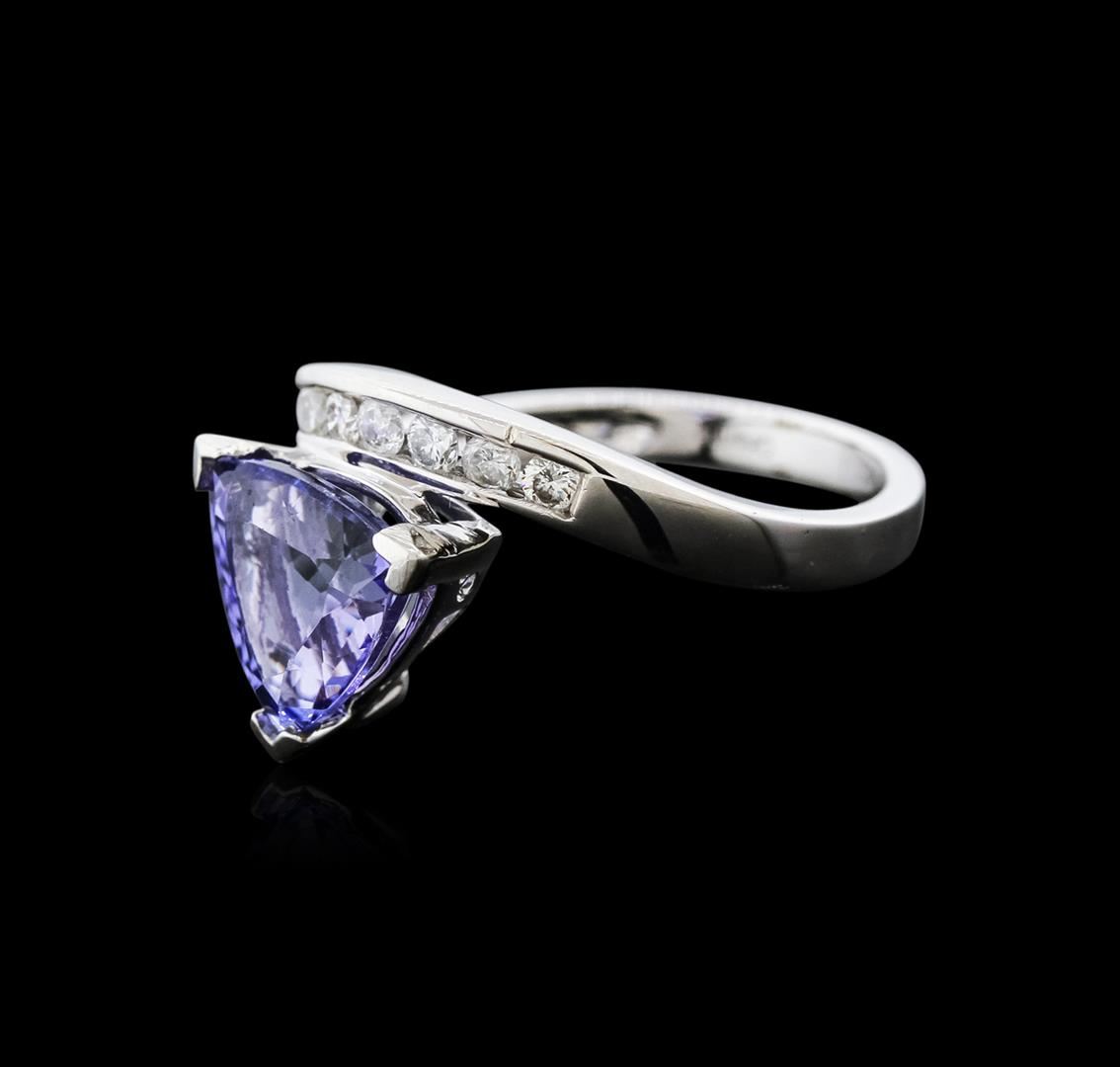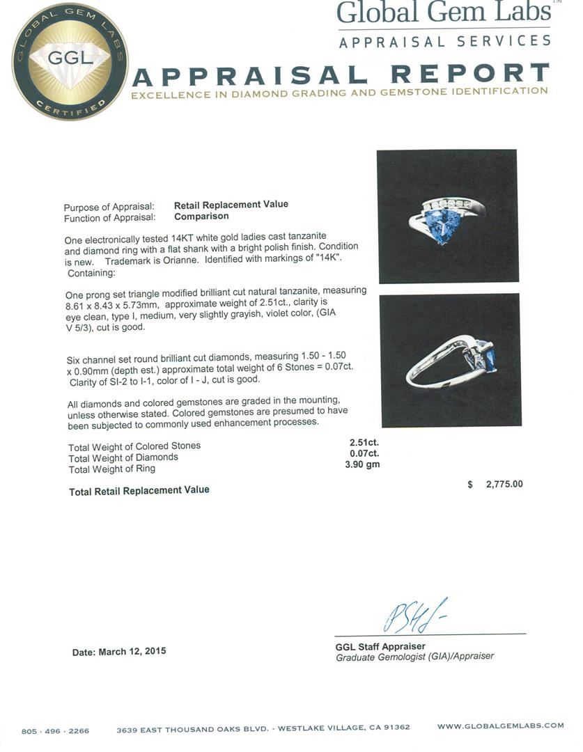 One electronically tested 14KT white gold ladies cast tanzanite and diamond ring with a flat shank with a bright polish finish. Trademark is Orianne. Identified with markings of "14K". Condition is new. Containing: One prong set triangle modified brilliant cut natural tanzanite, measuring 8.61 x 8.43 x 5.73mm, approximate weight of 2.51ct., clarity is eye clean, type I, medium, very slightly grayish, violet color, (GIA V 5/3), cut is good. Six channel set round brilliant cut diamonds, measuring 1.50 - 1.50 x 0.90mm (depth est.) approximate total weight of 6 Stones = 0.07ct. Clarity: SI-2 to I-1. Color: I - J, Cut is Good. All diamonds and colored gemstones are graded in the mounting, unless otherwise stated. Colored gemstones are presumed to have been subjected to commonly used enhancement processes.. Total Weight of Colored Stones 2.51ct. Total Weight of Diamonds 0.07ct. Total Weight of Ring 3.90 grams. GGL Appraised at $2,775.00.