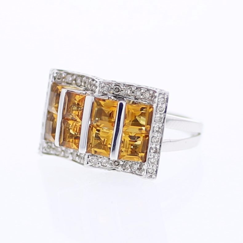 One 14KT White Gold 2.51ctw Citrine and Diamond Ring. (8) Citrine stones with a total weight of 2.51cts. (70) Diamonds with a total weight of 0.62cts. Total weight of this ring is 7.83 grams.