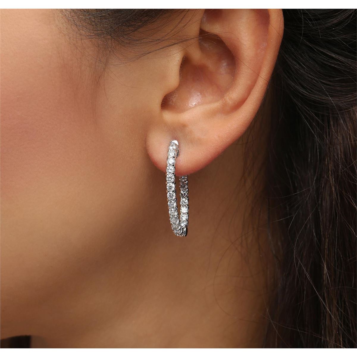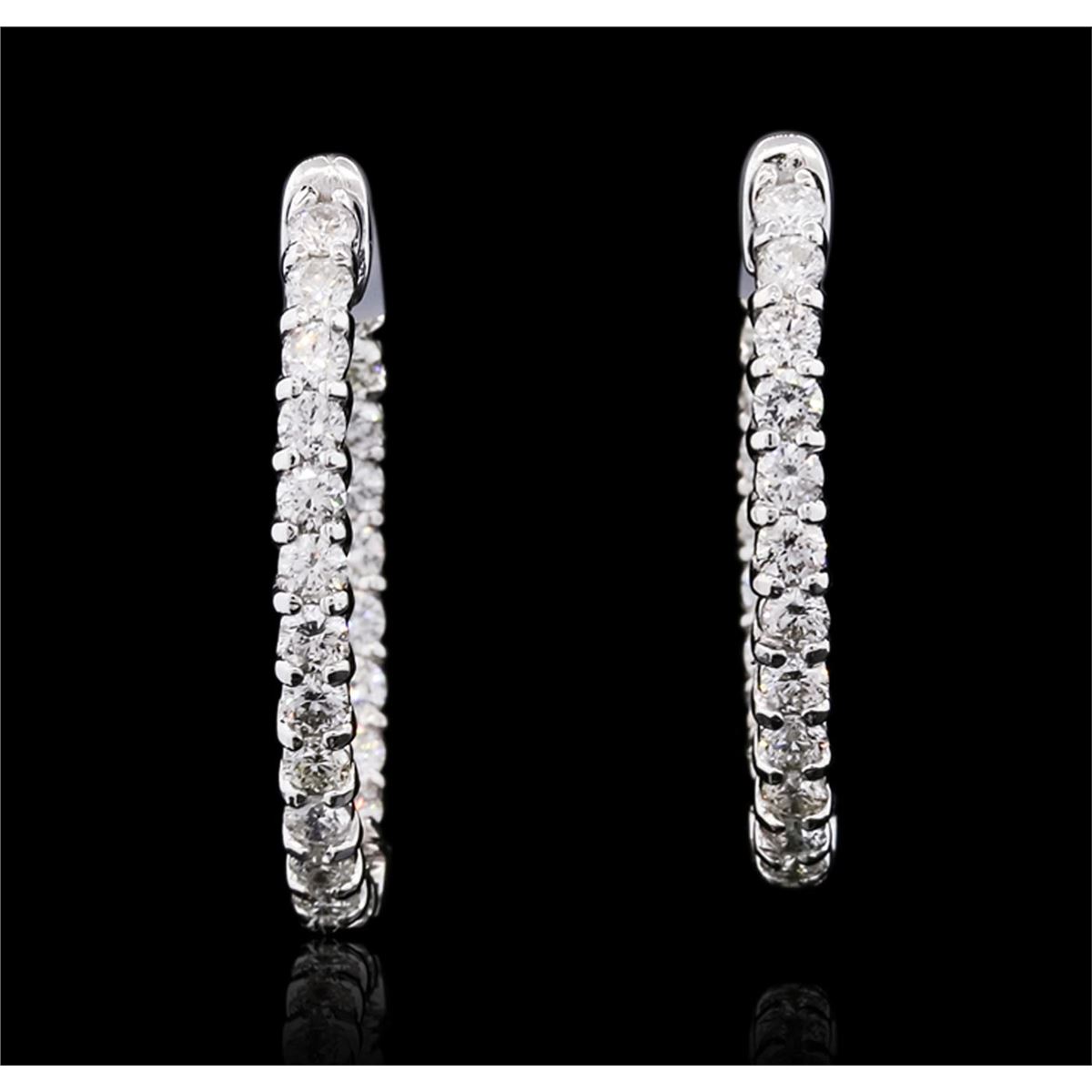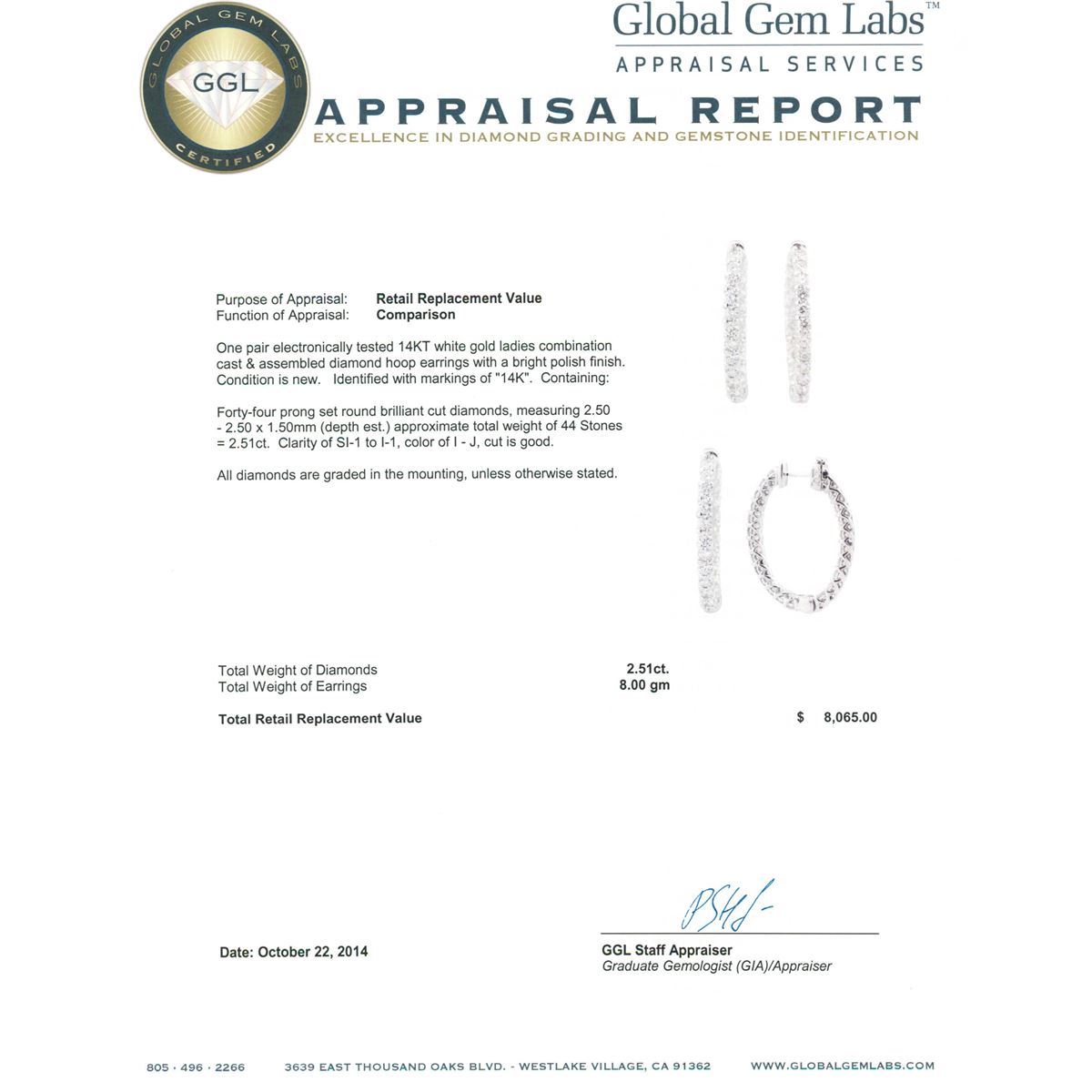 One pair electronically tested 14KT white gold ladies combination cast & assembled diamond hoop earrings with a bright polish finish. Identified with markings of "14K". Condition is new. Containing: Forty-Four prong set round brilliant cut diamonds, measuring 2.50 - 2.50 x 1.50mm (depth est.) approximate total weight of 44 Stones = 2.51ct. Clarity: SI-1 to I-1. Color: I - J, Cut is Good. All diamonds are graded in the mounting, unless otherwise stated. Total Weight of Diamonds 2.51ct. Total Weight of Earrings 8.00 grams. GGL Appraised at $8,065.00.