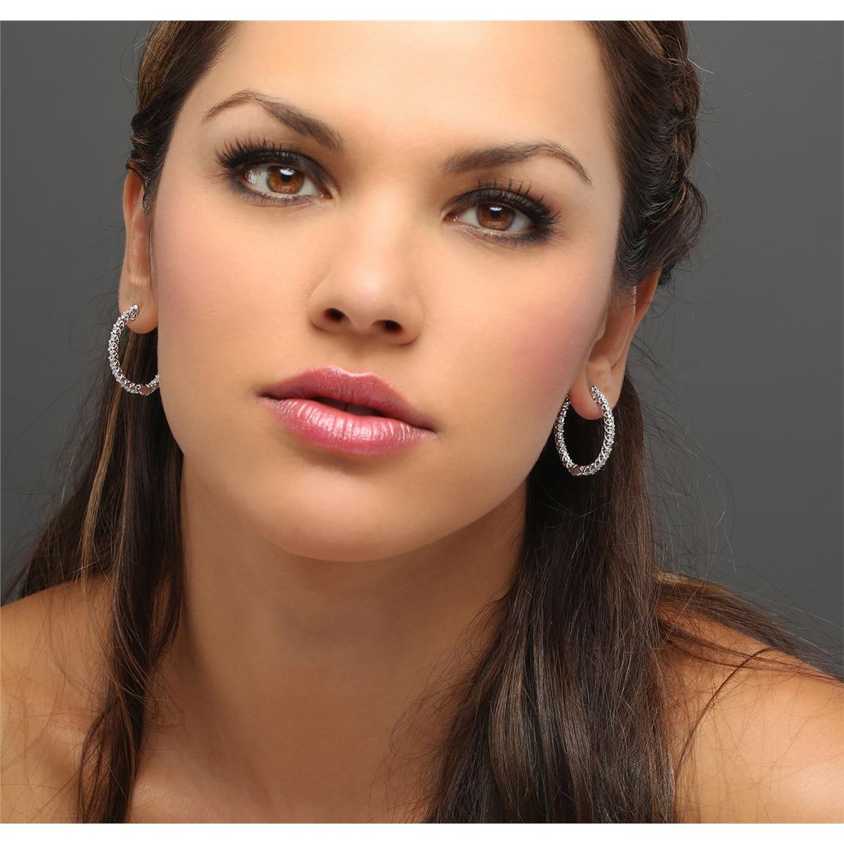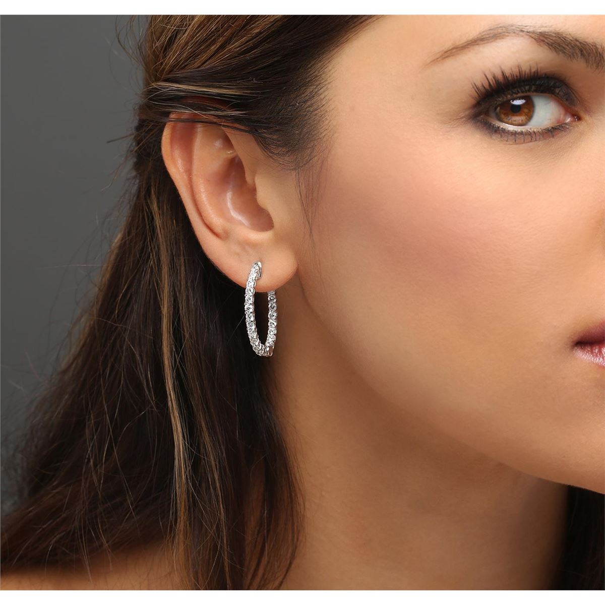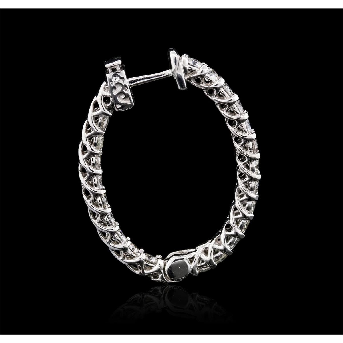 One pair electronically tested 14KT white gold ladies combination cast & assembled diamond hoop earrings with a bright polish finish. Identified with markings of "14K". Condition is new. Containing: Forty-Four prong set round brilliant cut diamonds, measuring 2.50 - 2.50 x 1.50mm (depth est.) approximate total weight of 44 Stones = 2.51ct. Clarity: SI-1 to I-1. Color: I - J, Cut is Good. All diamonds are graded in the mounting, unless otherwise stated. Total Weight of Diamonds 2.51ct. Total Weight of Earrings 8.00 grams. GGL Appraised at $8,065.00.