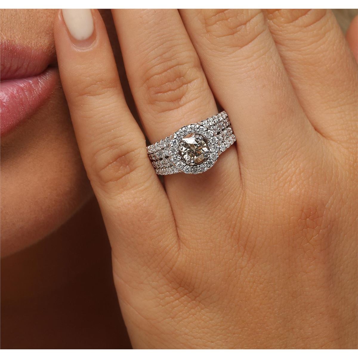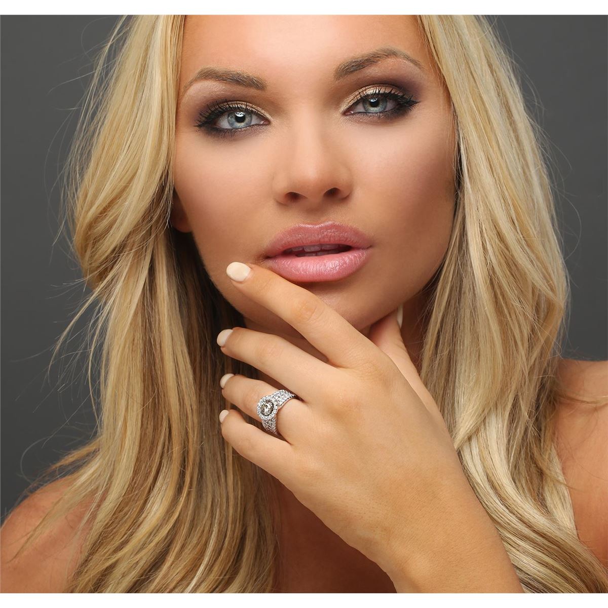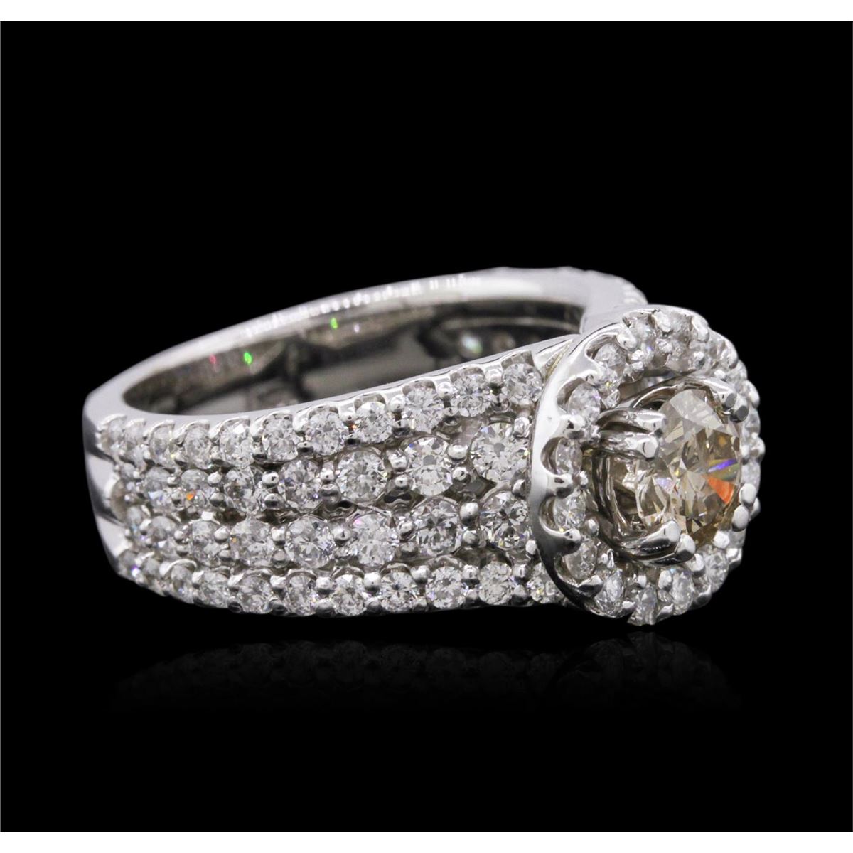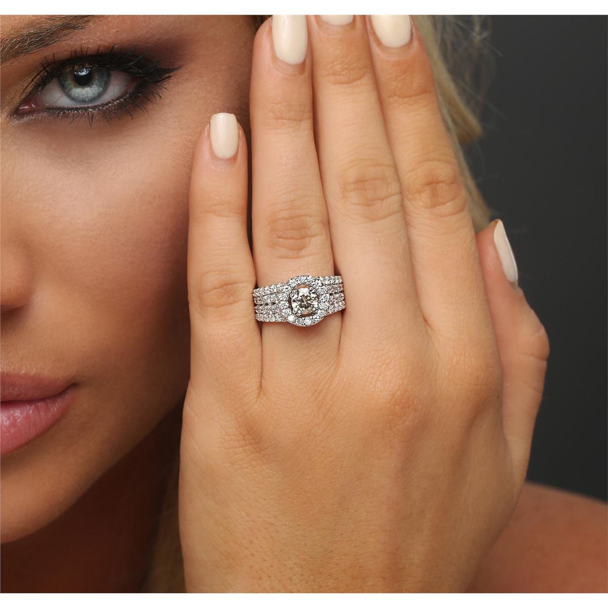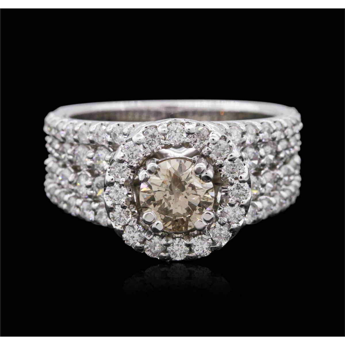 One electronically tested 14KT white gold ladies cast diamond ring with a bright polish finish. The featured diamond is set within a diamond bezel supported by elaborate diamond set shoulders, completed by a four and one-half millimeter wide band. Identified with markings of 14K. Condition is new, good workmanship. Containing: One prong set round brilliant cut diamond, measuring 5.75 - 5.70 x 3.20mm (depth est.), 5.00.%. GTCF approximate weight of 0.77ct with a medium blue fluorescence. Graded in the setting. Clarity: I-1. Depth: 55.9%. Table 62.8%. Ninety-Two prong set round brilliant cut diamonds, measuring 1.80 - 1.60 x 1.02mm (depth est.) approximate total weight of 92 Stones = 1.74ct. Graded in the setting. Clarity: SI-1 to I-1. Color: G - I. Total Weight of Diamonds 2.51ct. Total Weight of Ring 9.08 grams. AIG Appraised at $11,260.00.