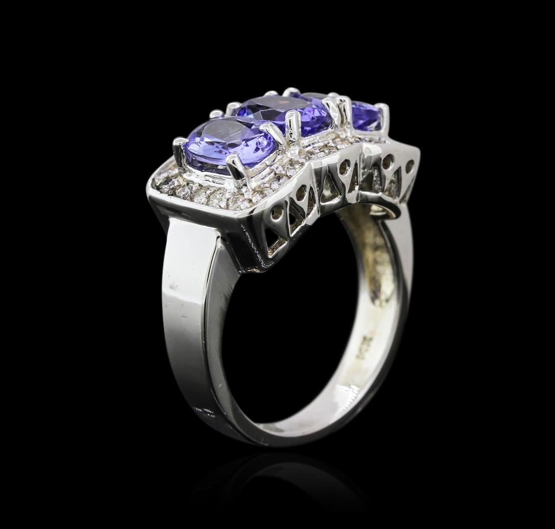 One electronically tested 14KT white gold ladies cast tanzanite and diamond three stone ring with a tapered shank with a bright polish finish. Identified with markings of "K14". Condition is new. Containing: Three prong set oval modified brilliant cut natural tanzanites, measuring 7.05 x 5.20 x 3.24mm, approximate total weight of 2.52ct., clarity is eye clean, type I, medium light, very slightly grayish, violet color, (GIA V 4/3), cut is good. Twenty-Eight prong set round brilliant cut diamonds, measuring 1.50 - 1.50 x 0.90mm (depth est.) approximate total weight of 28 Stones = 0.34ct. Clarity: SI-2 to I-1. Color: H - I, Cut is Good. Colored gemstones are presumed to have been subjected to commonly used enhancement processes. Diamonds and colored gemstones are graded in the mounting, unless otherwise stated. Total Weight of Colored Stones 2.52ct. Total Weight of Diamonds 0.34ct. Total Weight of Three Stone Ring 7.50 grams. GGL Appraised at $3,635.00.