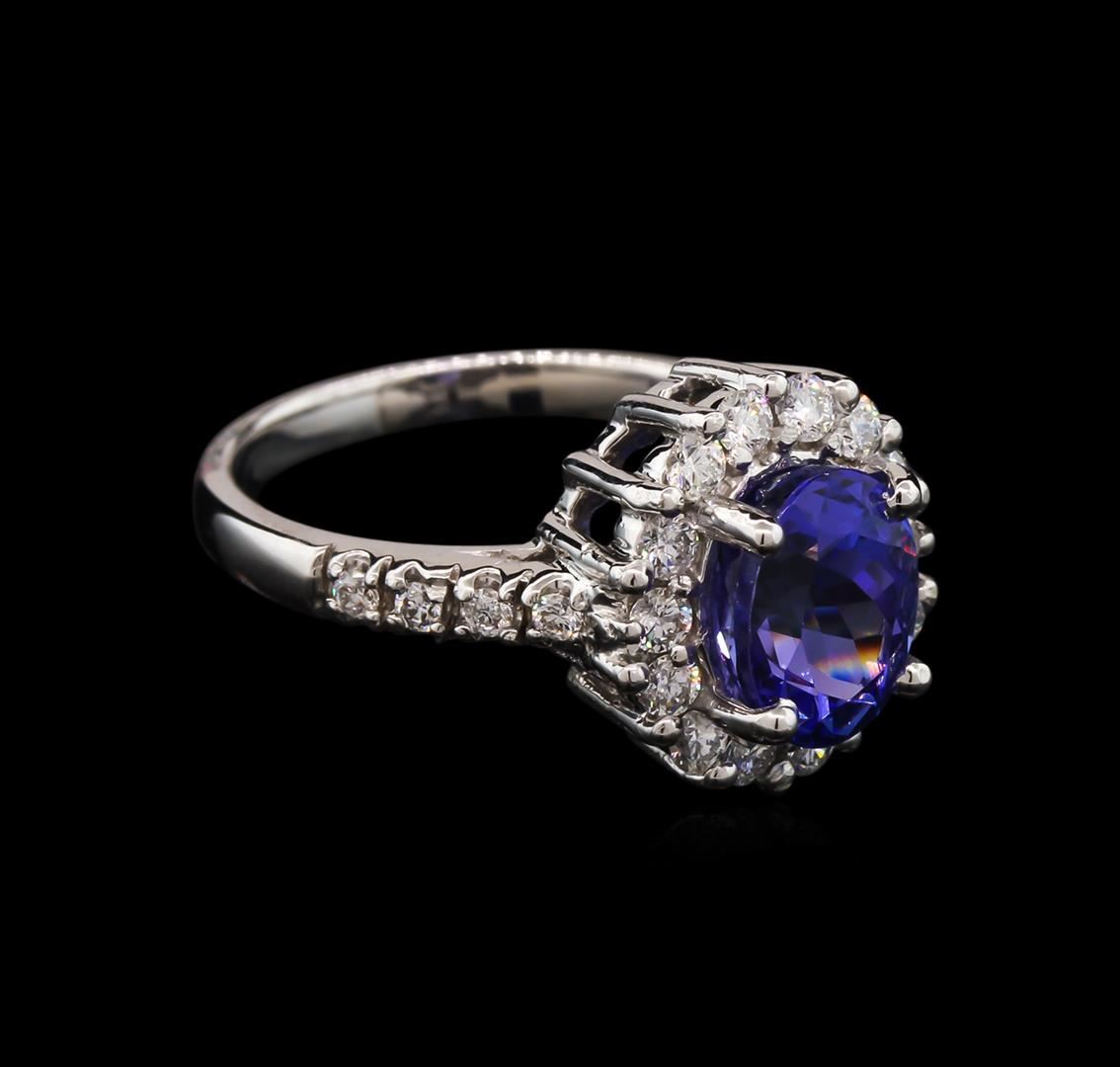 One electronically tested 14KT white gold ladies cast tanzanite and diamond ring with a bright polish finish. The featured tanzanite is set within a diamond bezel supported by diamond set shoulders, completed by a two millimeter wide band. Trademark is 14K. Condition is new, good workmanship. Containing: One prong set oval mixed cut natural tanzanite, measuring 8.65 x 6.63 x 5.77mm, exact weight 2.52ct., clarity is eye clean, type I, medium dark, very slightly grayish, bluish violet color, (GIA bV 6/3), cut is good. Transmitting light with no distortion, transparent. Graded in the setting. Tanzanite is a very rare gemstone that is only found in the country of Tanzania. Originally discovered in 1967. Tiffany & Company, named the stone Tanzanite. It is found in the Usumburu Mountains that border the Umba Valley of northern Tanzania. Tanzanite occurs in gray, brown, violet, blue, reddish-purple, & green. The gem is interesting because of its exceptional pleochroism. Rotated in different directions a tanzanite will exhibit multiple changes of color. Tanzanite has a low tolerance to ultrasonic cleaning, and should not be cleaned using this method. Twenty-Two prong set round brilliant cut diamonds, measuring 2.00 - 1.60 x 1.08mm exact total weight 22 Stones = 0.61ct. Graded in the setting. Clarity: SI-1 to I-1. Color: G - I. Total Weight of Colored Stones 2.52ct. Total Weight of Diamonds 0.61ct. Total Weight of Ring 5.24gm. AIG Appraised.