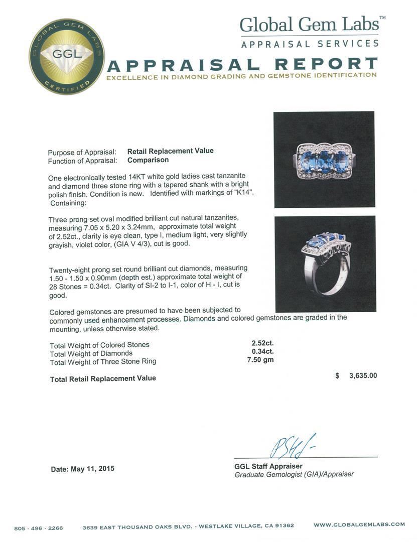 One electronically tested 14KT white gold ladies cast tanzanite and diamond three stone ring with a tapered shank with a bright polish finish. Identified with markings of "K14". Condition is new. Containing: Three prong set oval modified brilliant cut natural tanzanites, measuring 7.05 x 5.20 x 3.24mm, approximate total weight of 2.52ct., clarity is eye clean, type I, medium light, very slightly grayish, violet color, (GIA V 4/3), cut is good. Twenty-Eight prong set round brilliant cut diamonds, measuring 1.50 - 1.50 x 0.90mm (depth est.) approximate total weight of 28 Stones = 0.34ct. Clarity: SI-2 to I-1. Color: H - I, Cut is Good. Colored gemstones are presumed to have been subjected to commonly used enhancement processes. Diamonds and colored gemstones are graded in the mounting, unless otherwise stated. Total Weight of Colored Stones 2.52ct. Total Weight of Diamonds 0.34ct. Total Weight of Three Stone Ring 7.50 grams. GGL Appraised.