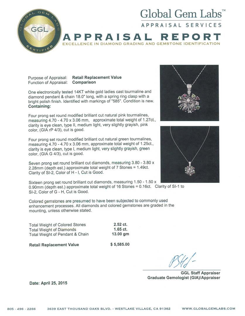 One electronically tested 14KT white gold ladies cast tourmaline and diamond pendant & chain 18.0" long, with a spring ring clasp with a bright polish finish. Identified with markings of "585". Condition is new. Containing: Four prong set round modified brilliant cut natural pink tourmalines, measuring 4.70 - 4.70 x 3.06 mm, approximate total weight of 1.27ct., clarity is eye clean, type II, medium light, very slightly grayish, pink color, (GIA rP 4/3), cut is good. Four prong set round modified brilliant cut natural green tourmalines, measuring 4.70 - 4.70 x 3.06 mm, approximate total weight of 1.25ct., clarity is eye clean, type I, medium light, very slightly grayish, green color, (GIA G 4/3), cut is good. Seven prong set round brilliant cut diamonds, measuring 3.80 - 3.80 x 2.28mm (depth est.) approximate total weight of 7 Stones = 1.49ct. Clarity: SI-2. Color: H - I, Cut is Good. Sixteen prong set round brilliant cut diamonds, measuring 1.50 - 1.50 x 0.90mm (depth est.) approximate total weight of 16 Stones = 0.16ct. Clarity: SI-1 to SI-2. Color: G - H, Cut is Good. Colored gemstones are presumed to have been subjected to commonly used enhancement processes. All diamonds and colored gemstones are graded in the mounting, unless otherwise stated. Total Weight of Colored Stones 2.52ct. Total Weight of Diamonds 1.65ct. Total Weight of Pendant & Chain 13.00 grams. GGL Appraised.