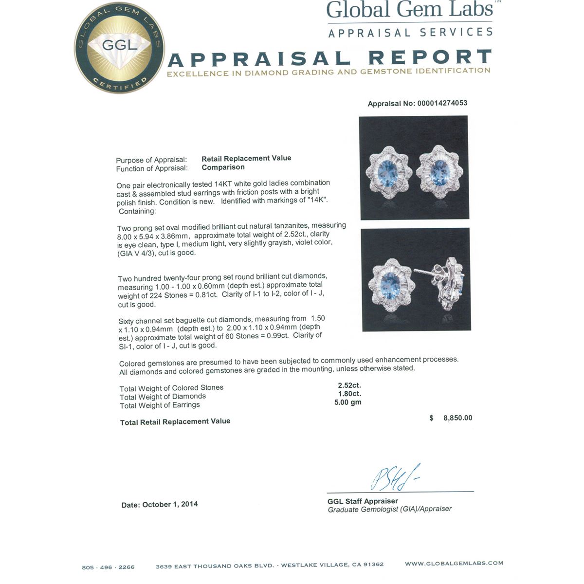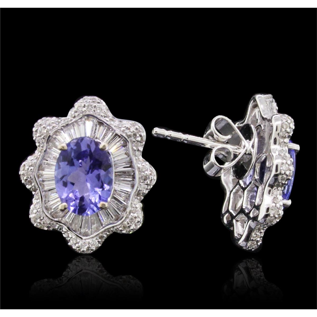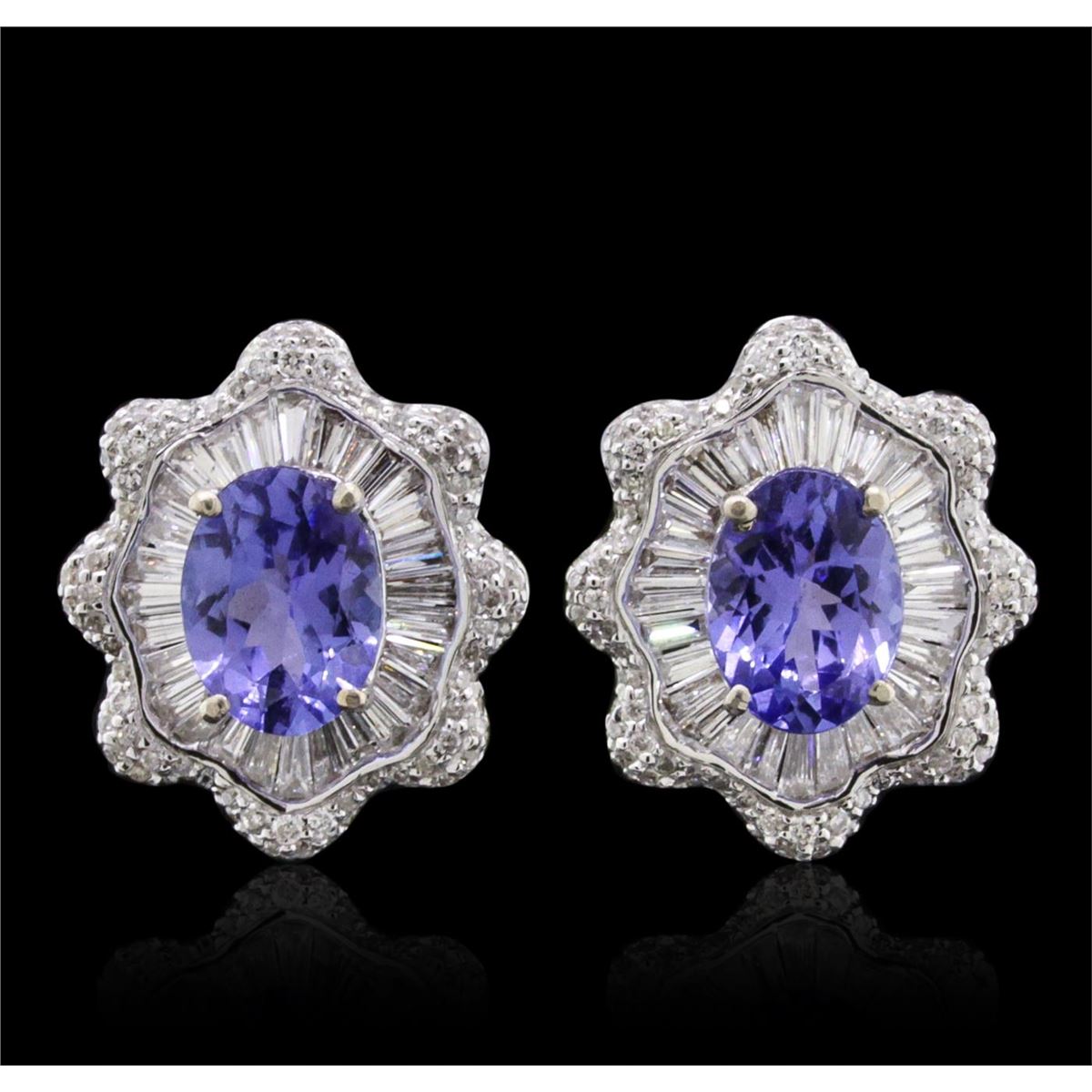 One pair electronically tested 14KT white gold ladies combination cast & assembled stud earrings with friction posts with a bright polish finish. Identified with markings of "14K". Condition is new. Containing: Two prong set oval modified brilliant cut natural tanzanites, measuring 8.00 x 5.94 x 3.86mm, approximate total weight of 2.52ct., clarity is eye clean, type I, medium light, very slightly grayish, violet color, (GIA V 4/3), cut is good. Two Hundred Twenty-Four prong set round brilliant cut diamonds, measuring 1.00. - 1.00 x 0.60mm (depth est.) approximate total weight of 224 Stones = 0.81ct. Clarity: I-1 to I-2. Color: I - J, Cut is Good. Sixty channel set baguette cut diamonds, measuring from 1.50 x 1.10 x 0.94mm (depth est.) to 2.00 x 1.10 x 0.94mm (depth est.) approximate total weight of 60 Stones = 0.99ct. Clarity: SI-1. Color: I - J, Cut is Good. Colored gemstones are presumed to have been subjected to commonly used enhancement processes. All diamonds and colored gemstones are graded in the mounting, unless otherwise stated. Total Weight of Colored Stones 2.52ct. Total Weight of Diamonds 1.80ct. Total Weight of Earrings 5.00. grams. GGL Appraised at $8,850.00.