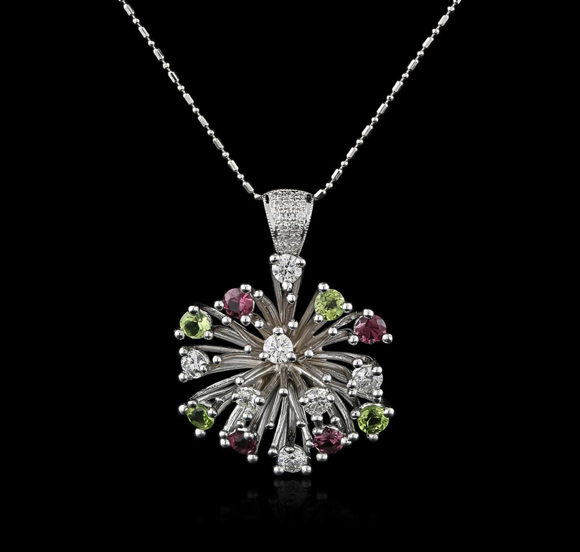 One electronically tested 14KT white gold ladies cast tourmaline and diamond pendant & chain 18.0" long, with a spring ring clasp with a bright polish finish. Identified with markings of "585". Condition is new. Containing: Four prong set round modified brilliant cut natural pink tourmalines, measuring 4.70 - 4.70 x 3.06 mm, approximate total weight of 1.27ct., clarity is eye clean, type II, medium light, very slightly grayish, pink color, (GIA rP 4/3), cut is good. Four prong set round modified brilliant cut natural green tourmalines, measuring 4.70 - 4.70 x 3.06 mm, approximate total weight of 1.25ct., clarity is eye clean, type I, medium light, very slightly grayish, green color, (GIA G 4/3), cut is good. Seven prong set round brilliant cut diamonds, measuring 3.80 - 3.80 x 2.28mm (depth est.) approximate total weight of 7 Stones = 1.49ct. Clarity: SI-2. Color: H - I, Cut is Good. Sixteen prong set round brilliant cut diamonds, measuring 1.50 - 1.50 x 0.90mm (depth est.) approximate total weight of 16 Stones = 0.16ct. Clarity: SI-1 to SI-2. Color: G - H, Cut is Good. Colored gemstones are presumed to have been subjected to commonly used enhancement processes. All diamonds and colored gemstones are graded in the mounting, unless otherwise stated. Total Weight of Colored Stones 2.52ct. Total Weight of Diamonds 1.65ct. Total Weight of Pendant & Chain 13.00 grams. GGL Appraised at $5,585.00.