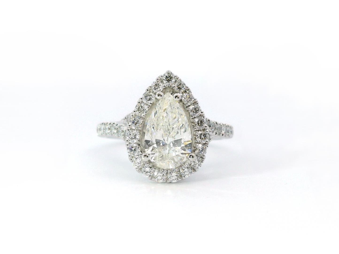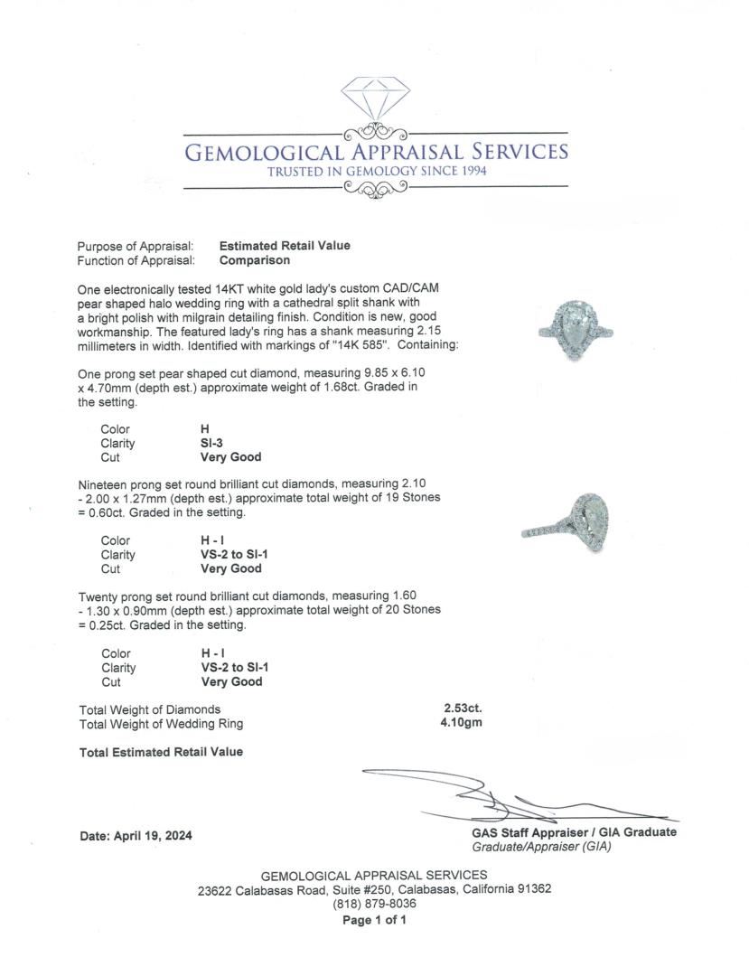One electronically tested 14KT white gold lady's custom CAD/CAM pear shaped halo wedding ring with a cathedral split shank with a bright polish with milgrain detailing finish. Condition is new, good workmanship. The featured lady's ring has a shank measur GAS Appraised.
