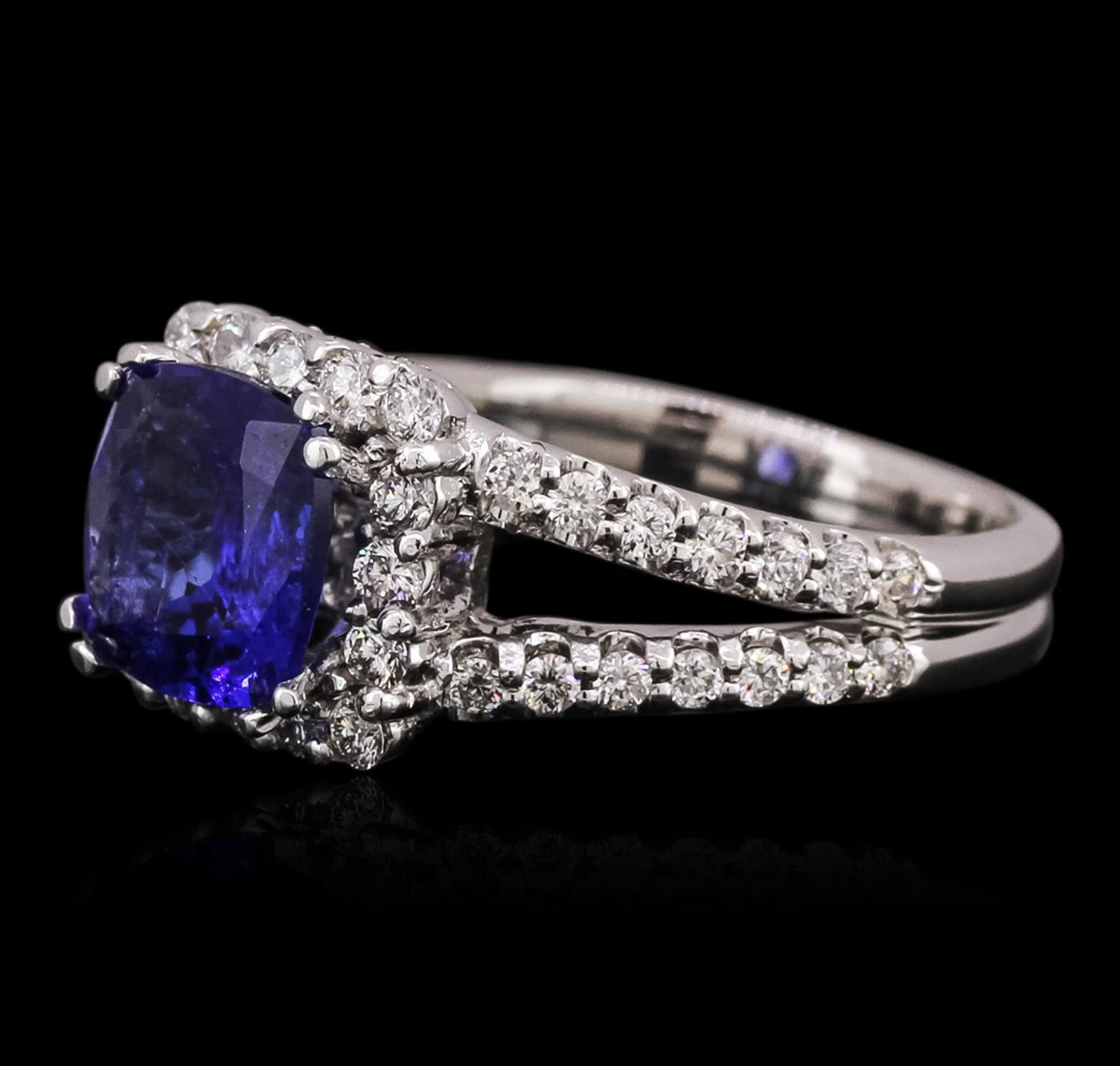 One electronically tested 14KT white gold ladies cast tanzanite and diamond ring with a bright polish finish. Identified with markings of "14KT". Condition is new. Containing: One prong set square cushion modified brilliant cut natural tanzanite, measuring 7.90 x 7.90 x 5.14mm, approximate weight of 2.53ct., clarity is eye clean, type I, medium, moderately strong, violetish blue color, (GIA vB 5/4), cut is very good. Forty-Four prong set round brilliant cut diamonds, measuring 1.30 - 1.30 x 0.78mm (depth est.) approximate total weight of 44 Stones = 0.35ct. Clarity: SI-2 to I-1. Color: I - J, Cut is Good. Colored gemstones are presumed to have been subjected to commonly used enhancement processes. All diamonds and colored gemstones are graded in the mounting, unless otherwise stated. Total Weight of Colored Stones 2.53ct. Total Weight of Diamonds 0.35ct. Total Weight of Ring 5.80 grams. GGL Appraised at $4,760.00.