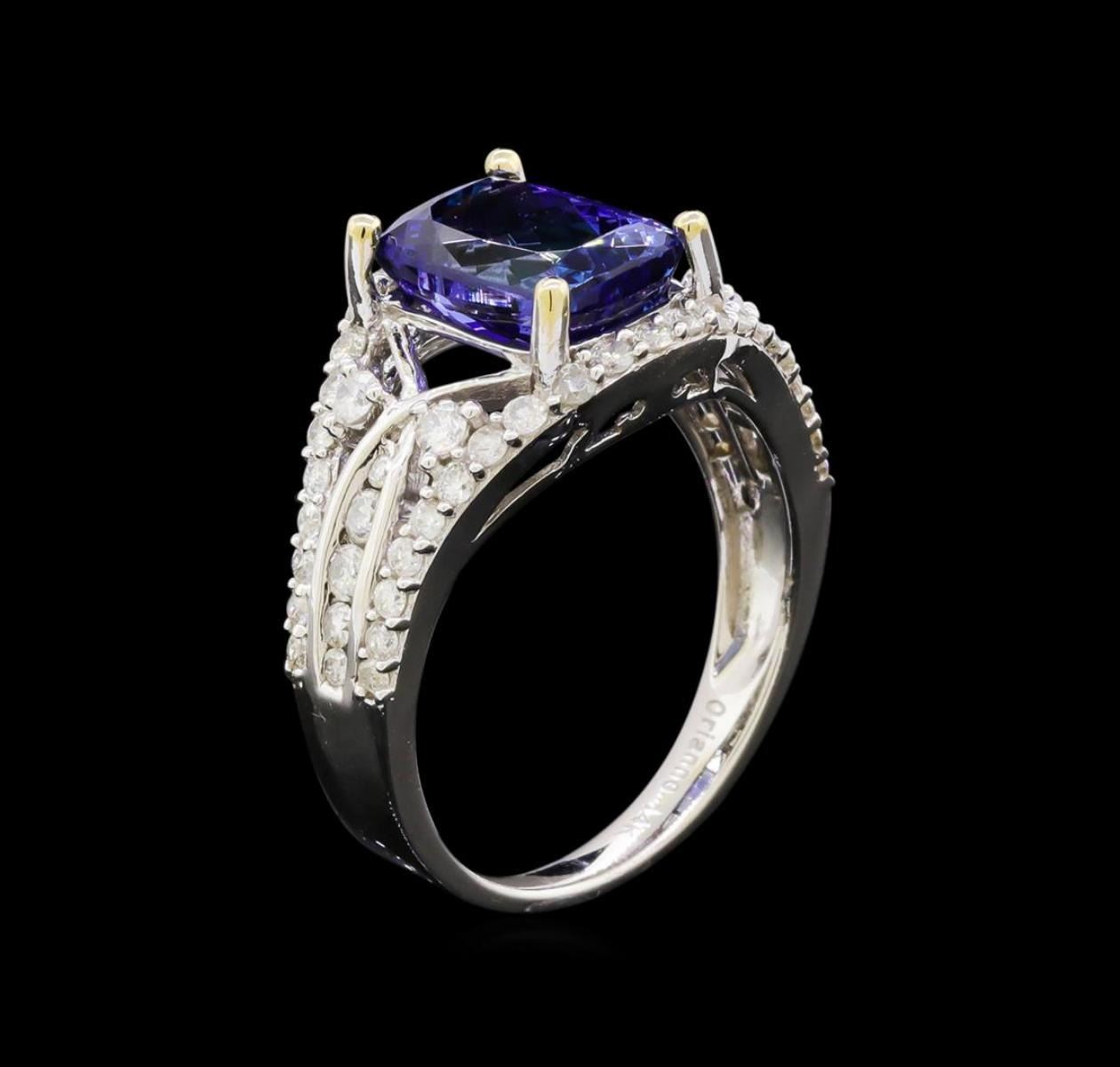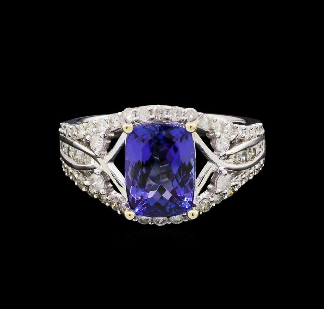 One electronically tested 14KT white gold ladies combination cast & assembled tanzanite and diamond ring with a split shank with a bright polish finish. Identified with markings of "14K". Condition is new. Containing: One prong set rectangular cushion modified brilliant cut natural tanzanite, measuring 9.78 x 7.24 x 4.53mm, approximate weight of 2.53ct., clarity is eye clean, type I, medium, very slightly grayish, violet color, (GIA V 5/3), cut is good. Sixty prong set round brilliant cut diamonds, measuring 1.80 - 1.40 x 0.96mm (depth est.) approximate total weight of 60 Stones = 0.89ct. Clarity: I-1 to I-3. Color: I - J, Cut is Good. Colored gemstones are presumed to have been subjected to commonly used enhancement processes. All diamonds and colored gemstones are graded in the mounting, unless otherwise stated. Total Weight of Colored Stones 2.53ct. Total Weight of Diamonds 0.89ct. Total Weight of Ring 4.80 grams. GGL Appraised.