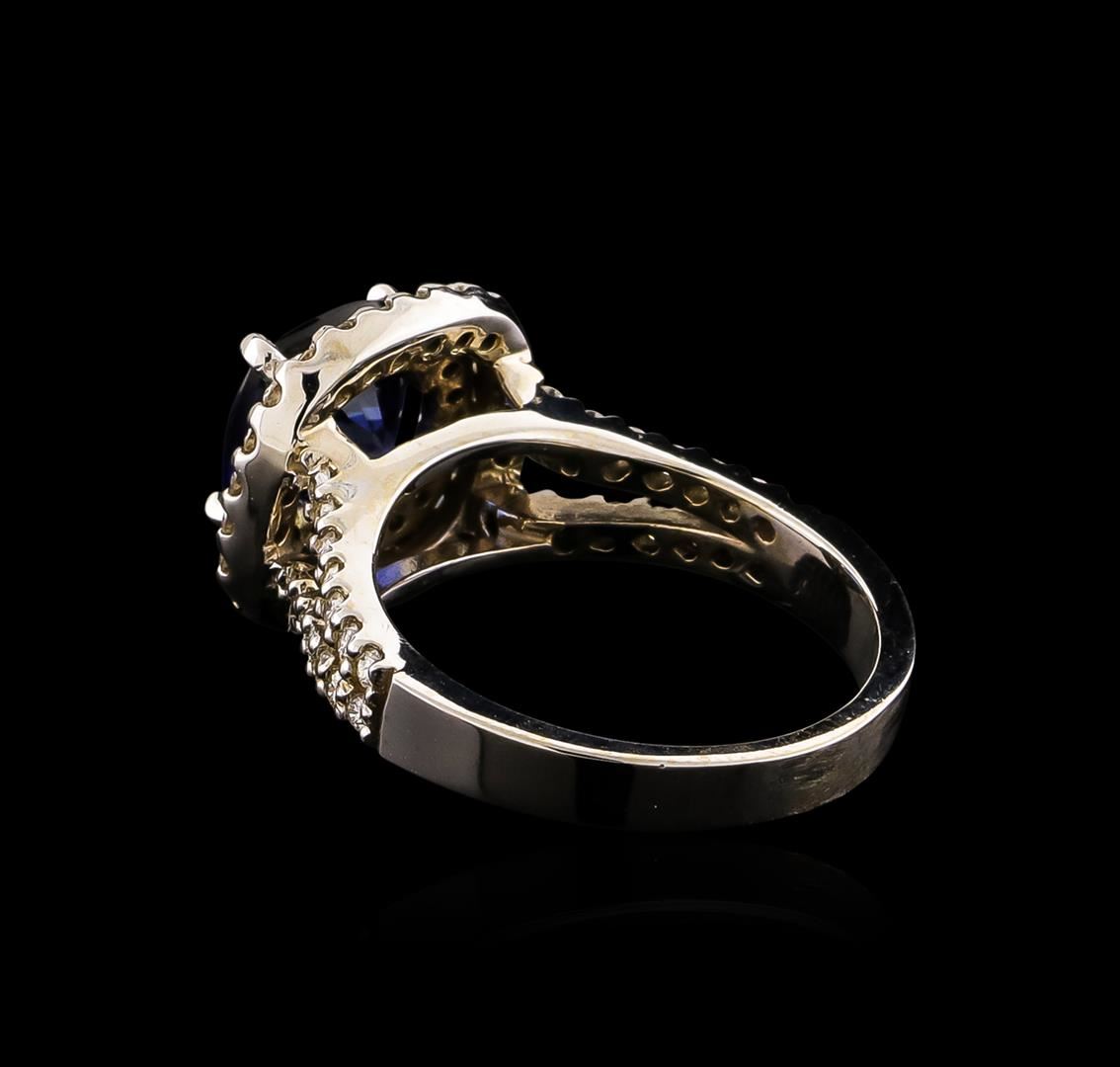 One electronically tested 14KT white gold Ladies combination cast & assembled ring with a high polish finish. Condition is new. Identified with markings of "585". Containing: One prong set square cushion modified mixed cut natural tanzanite, measuring 8.00 x 8.00 x 4.60mm, approximate weight of 2.53ct., clarity is eye clean, type I, medium dark, moderately strong, blue color, (GIA B 6/4), cut is very good. Colored gemstones are presumed to have been subjected to commonly used color/clarity enhancement processes. Seventy prong set round brilliant cut diamonds, measuring 1.30 - 1.30 x 0.86mm (depth est.) approximate. Total Weight of 70 Stones = 0.71ct. Clarity: I-1 to I-2. Color: I - J, Cut is Good. Total Weight of Colored Stones 2.53ct. Total Weight of Diamonds 0.71ct. Total Weight of Ring 5.80 grams. GGL Appraised.