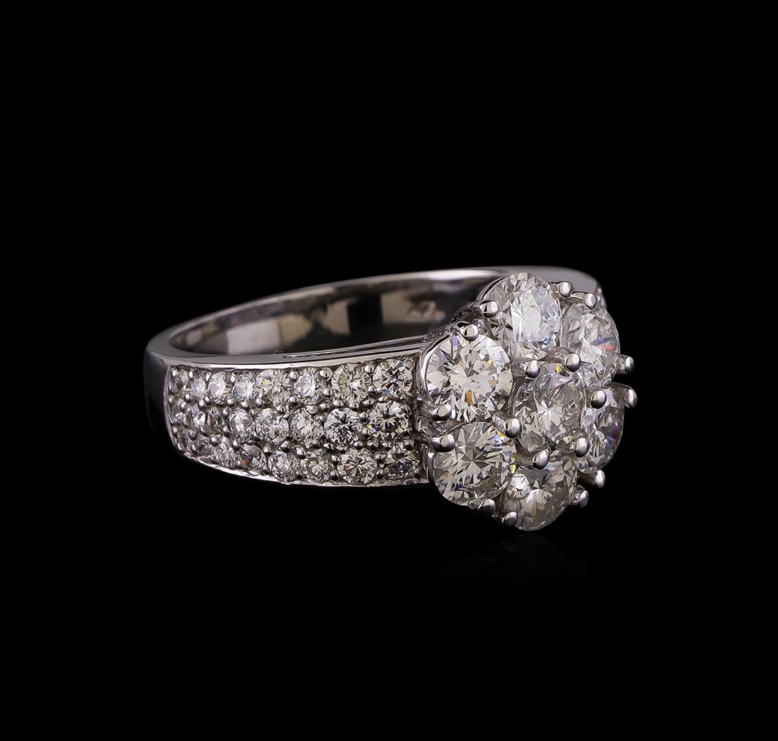 One electronically tested 14KT white gold ladies combination cast & assembled diamond ring with a flat shank with a bright polish finish. Identified with markings of "K14". Condition is new. Containing: Seven prong set round brilliant cut diamonds, measuring 4.20 - 4.00 x 2.46mm (depth est.) approximate total weight of 7 Stones = 1.77ct. Clarity: SI-2. Color: I - J, Cut is Good. Forty-Eight prong set round brilliant cut diamonds, measuring 1.80 - 1.50 x 0.99mm (depth est.) approximate total weight of 48 Stones = 0.79ct. Clarity: SI-1 to I-1. Color: I - J, Cut is Good. All diamonds are graded in the mounting, unless otherwise stated. Total Weight of Diamonds 2.55ct. Total Weight of Ring 5.50 grams. GGL Appraised at $10,410.00.