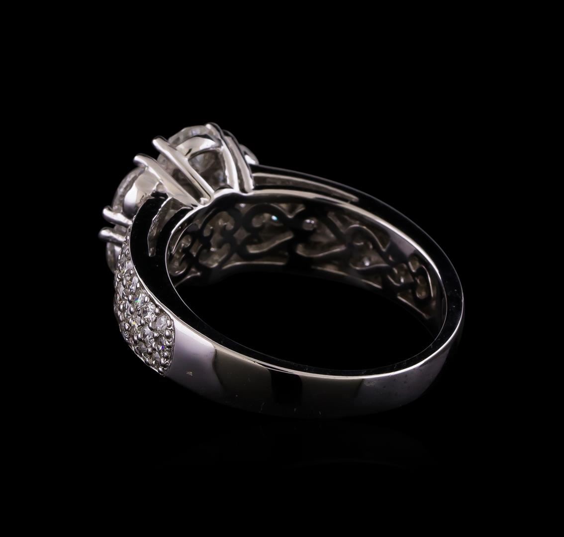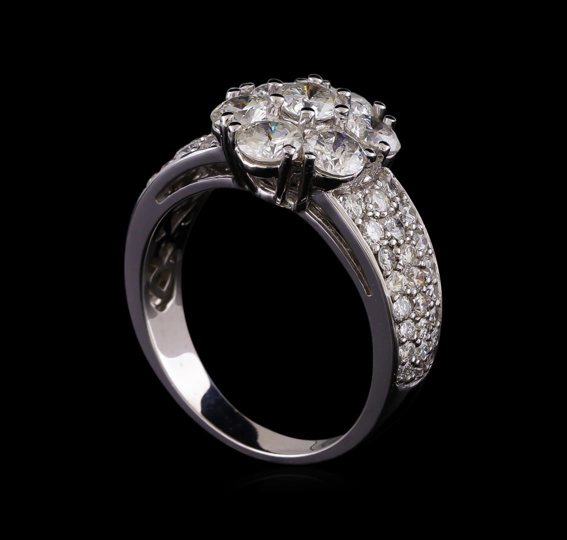 One electronically tested 14KT white gold ladies combination cast & assembled diamond ring with a flat shank with a bright polish finish. Identified with markings of "K14". Condition is new. Containing: Seven prong set round brilliant cut diamonds, measuring 4.20 - 4.00 x 2.46mm (depth est.) approximate total weight of 7 Stones = 1.77ct. Clarity: SI-2. Color: I - J, Cut is Good. Forty-Eight prong set round brilliant cut diamonds, measuring 1.80 - 1.50 x 0.99mm (depth est.) approximate total weight of 48 Stones = 0.79ct. Clarity: SI-1 to I-1. Color: I - J, Cut is Good. All diamonds are graded in the mounting, unless otherwise stated. Total Weight of Diamonds 2.55ct. Total Weight of Ring 5.50 grams. GGL Appraised at $10,410.00.