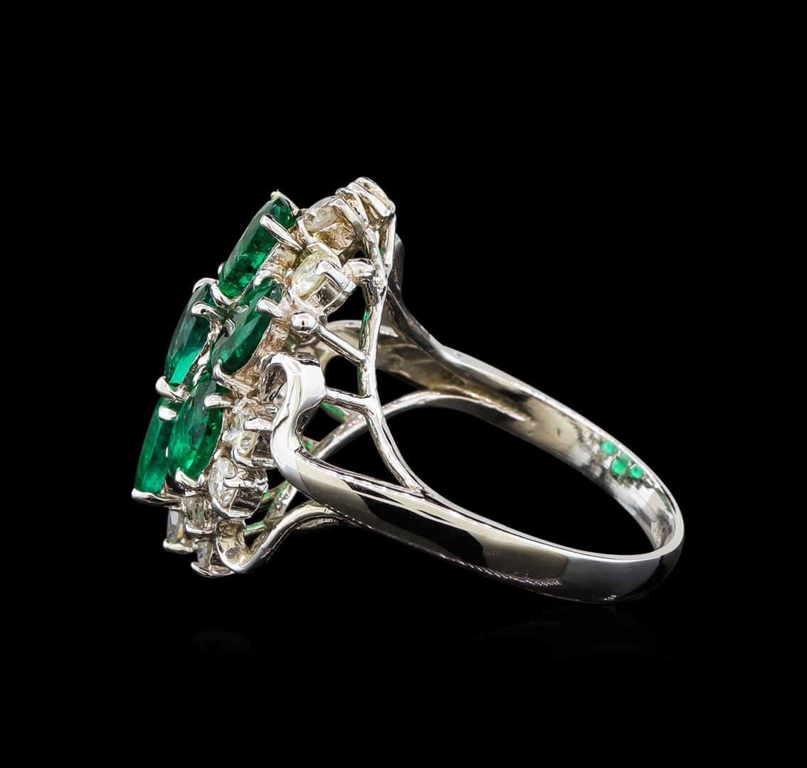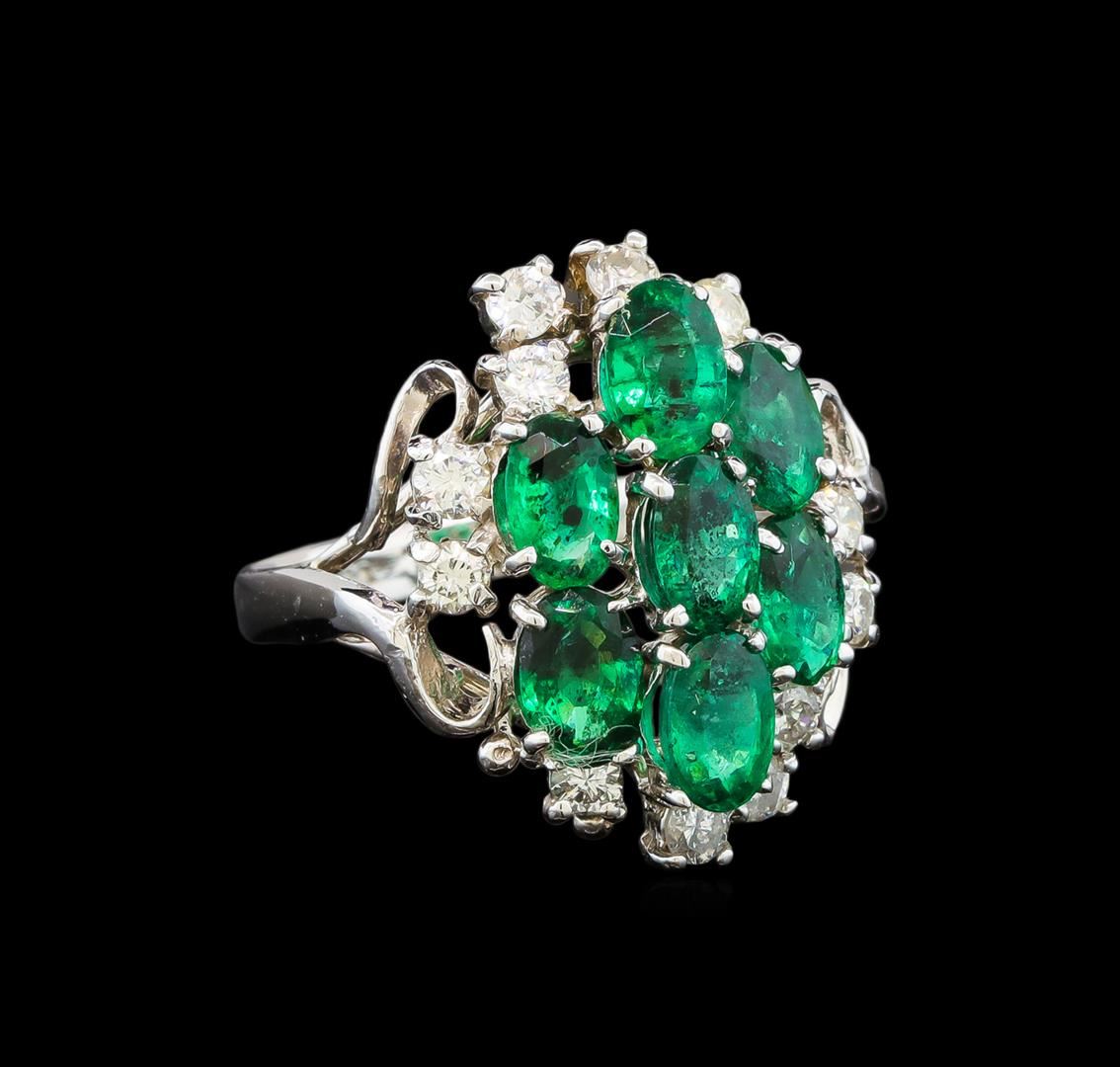 One electronically tested 14KT white gold ladies cast emerald and diamond ring with a bright polish finish. The ring features an organized emerald cluster supported by diamond accents, completed by a two and one-half millimeter wide band. Identified with markings of "14K". Condition is new, good workmanship. Containing: Seven prong set oval mixed cut natural emeralds, measuring 6.00 x 4.00 x 2.60mm, approximate total weight of 2.55ct., clarity is heavily included, type III, medium dark, moderately strong, very slightly bluish green color, (GIA vslbG 6/4), cut is good. Transmitting light with a minimum of distortion, transparent. Naturally occurring internal & external characteristics are present. Measurements &the color grade are an average for the group. Indications of oil residue. Graded in the setting. Twelve prong set round brilliant cut diamonds, measuring 2.50 - 2.40 x 1.47mm (depth est.) approximate total weight of 12 Stones = 0.74ct. Graded in the setting. Clarity: SI-1 to I-1. Color: G - I. Total Weight of Colored Stones 2.55ct. Total Weight of Diamonds 0.74ct. Total Weight of Ring 5.12 grams. AIG Appraised at $4,715.00.