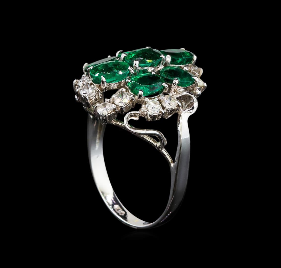 One electronically tested 14KT white gold ladies cast emerald and diamond ring with a bright polish finish. The ring features an organized emerald cluster supported by diamond accents, completed by a two and one-half millimeter wide band. Identified with markings of "14K". Condition is new, good workmanship. Containing: Seven prong set oval mixed cut natural emeralds, measuring 6.00 x 4.00 x 2.60mm, approximate total weight of 2.55ct., clarity is heavily included, type III, medium dark, moderately strong, very slightly bluish green color, (GIA vslbG 6/4), cut is good. Transmitting light with a minimum of distortion, transparent. Naturally occurring internal & external characteristics are present. Measurements &the color grade are an average for the group. Indications of oil residue. Graded in the setting. Twelve prong set round brilliant cut diamonds, measuring 2.50 - 2.40 x 1.47mm (depth est.) approximate total weight of 12 Stones = 0.74ct. Graded in the setting. Clarity: SI-1 to I-1. Color: G - I. Total Weight of Colored Stones 2.55ct. Total Weight of Diamonds 0.74ct. Total Weight of Ring 5.12 grams. AIG Appraised at $4,715.00.