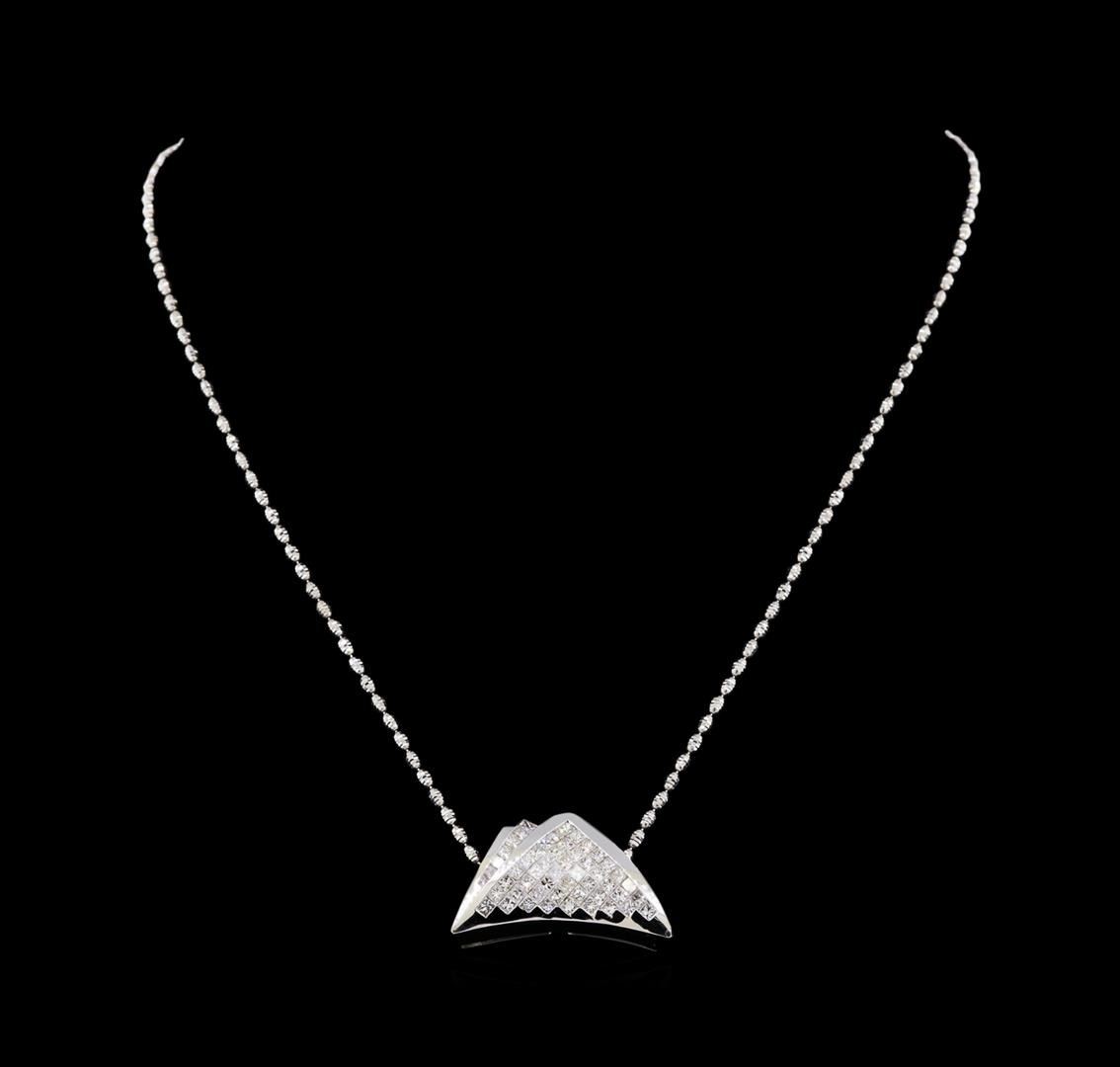 One electronically tested 14KT white gold ladies combination cast & die struck pendant & chain 18.0" long, medium fancy link with a lobster claw clasp with a bright polish finish. Identified with markings of "585". Condition is new. Containing: Fifty-Two invisible set princess cut diamonds, measuring 2.00 x 2.00 x 1.50mm (depth est.) approximate total weight of 52 Stones = 2.56ct. Clarity: SI-1. Color: I - J, Cut is Very Good. All diamonds are graded in the mounting, unless otherwise stated. Total Weight of Diamonds 2.56ct. Total Weight of Pendant & Chain 20.30 grams. GGL Appraised.