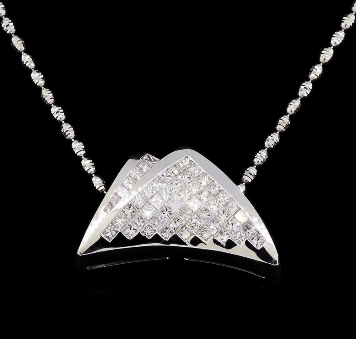 One electronically tested 14KT white gold ladies combination cast & die struck pendant & chain 18.0" long, medium fancy link with a lobster claw clasp with a bright polish finish. Identified with markings of "585". Condition is new. Containing: Fifty-Two invisible set princess cut diamonds, measuring 2.00 x 2.00 x 1.50mm (depth est.) approximate total weight of 52 Stones = 2.56ct. Clarity: SI-1. Color: I - J, Cut is Very Good. All diamonds are graded in the mounting, unless otherwise stated. Total Weight of Diamonds 2.56ct. Total Weight of Pendant & Chain 20.30 grams. GGL Appraised.