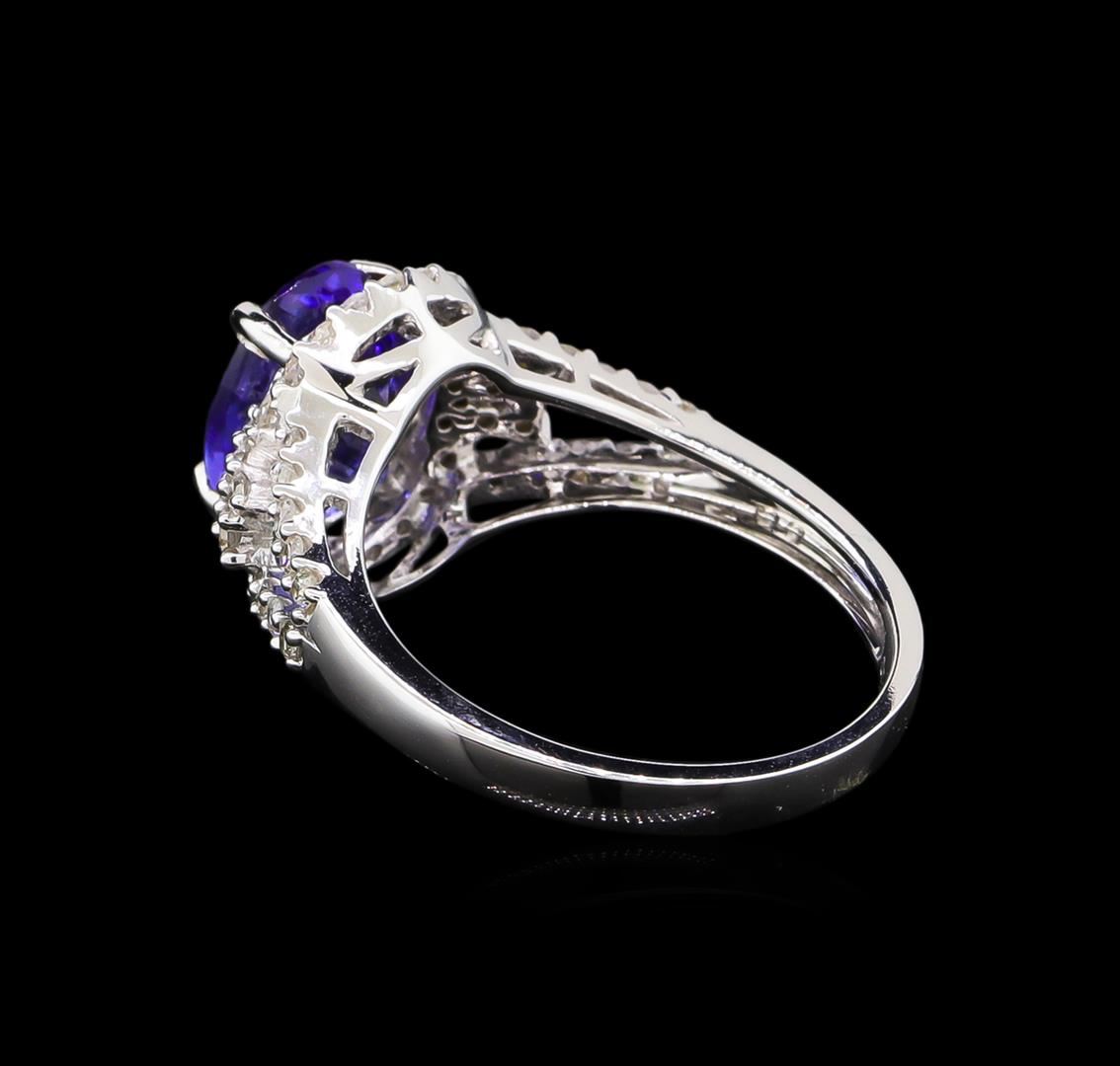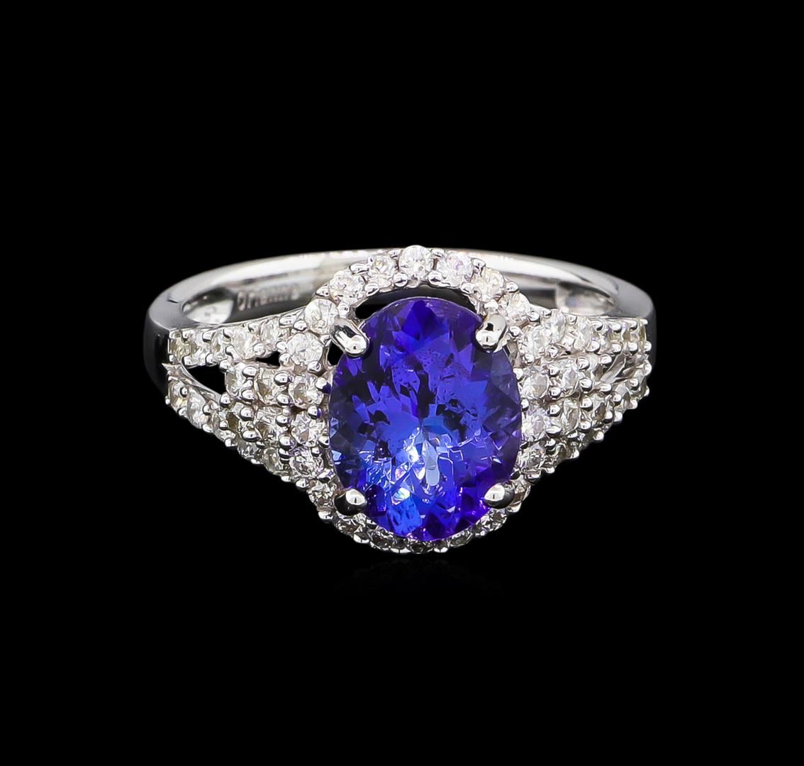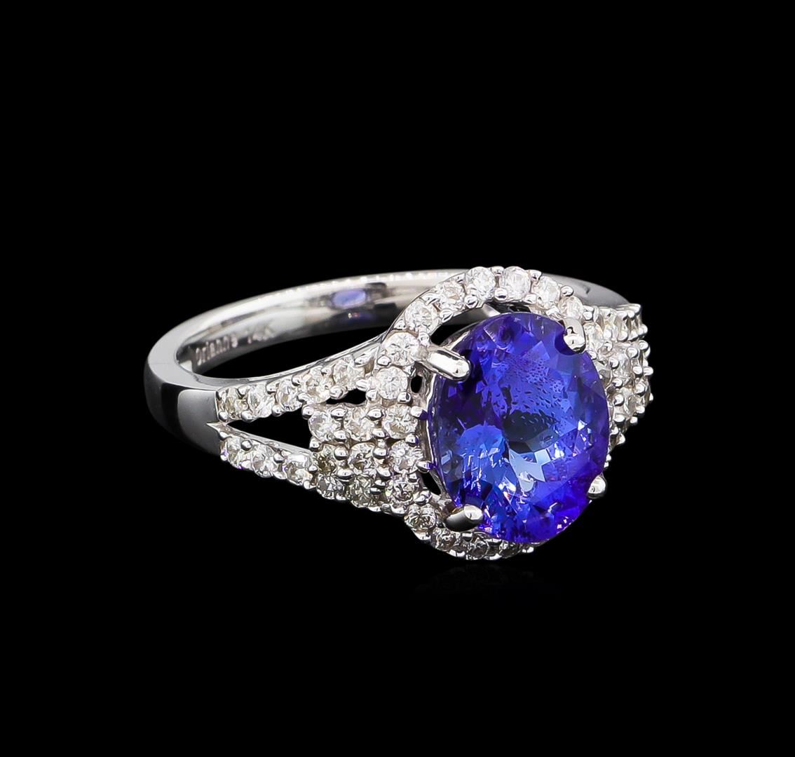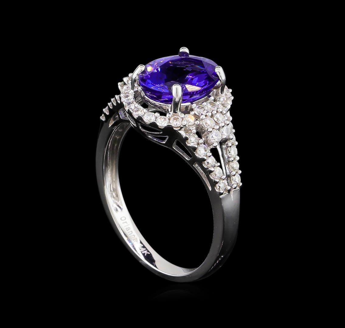 One electronically tested 14KT white gold ladies cast tanzanite and diamond ring with a bright polish finish. The featured tanzanite is set within a diamond bezel, supported by diamond set shoulders and completed by a two and one-half millimeter wide band. Trademark is Orianne. Identified with markings of "14K". Condition is new, good workmanship. Containing: One prong set oval mixed cut natural tanzanite, measuring 9.65 x 7.60 x 5.20mm, approximate weight of 2.56ct., clarity is eye clean, type I, medium dark, very slightly grayish, bluish violet color, (GIA bV 6/3), cut is good. Transmitting light with no distortion, transparent. Graded in the setting.Tanzanite is a very rare gemstone that is only found in the country of Tanzania. Originally discovered in 1967. Tiffany & Company, named the stone Tanzanite. It is found in the Usumburu Mountains that border the Umba Valley of northern Tanzania. Tanzanite occurs in gray, brown, violet, blue, reddish-purple, & green. The gem is interesting because of its exceptional pleochroism. Rotated in different directions a tanzanite will exhibit multiple changes of color. Tanzanite has a low tolerance to ultrasonic cleaning, and should not be cleaned using this method.Fifty prong set round brilliant cut diamonds, measuring 1.40 - 1.40 x 0.84mm (depth est.) approximate. Total Weight of 50 Stones = 0.60ct. Graded in the setting. Clarity: SI-2 to I-1 . Color: G - I. Total Weight of Colored Stones 2.56ct. Total Weight of Diamonds 0.60ct. Total Weight of Ring 3.90gm. AIG Appraised at $8,835.00.
