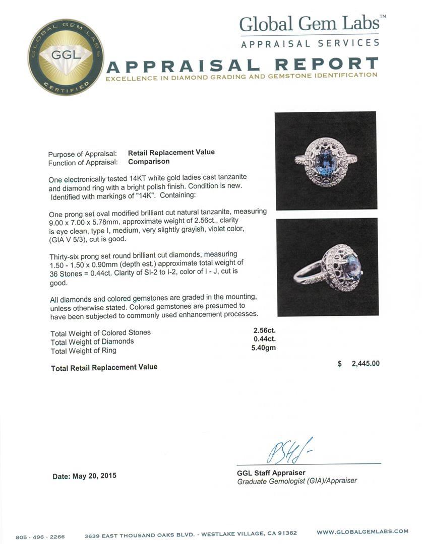 One electronically tested 14KT white gold ladies cast tanzanite and diamond ring with a bright polish finish. Identified with markings of "14K". Condition is new. Containing: One prong set oval modified brilliant cut natural tanzanite, measuring 9.00 x 7.00 x 5.78mm, approximate weight of 2.56ct., clarity is eye clean, type I, medium, very slightly grayish, violet color, (GIA V 5/3), cut is good. Thirty-Six prong set round brilliant cut diamonds, measuring 1.50 - 1.50 x 0.90mm (depth est.) approximate total weight of 36 Stones = 0.44ct. Clarity: SI-2 to I-2. Color: I - J, Cut is Good. All diamonds and colored gemstones are graded in the mounting, unless otherwise stated. Colored gemstones are presumed to have been subjected to commonly used enhancement processes. Total Weight of Colored Stones 2.56ct. Total Weight of Diamonds 0.44ct. Total Weight of Ring 5.40 grams. GGL Appraised.