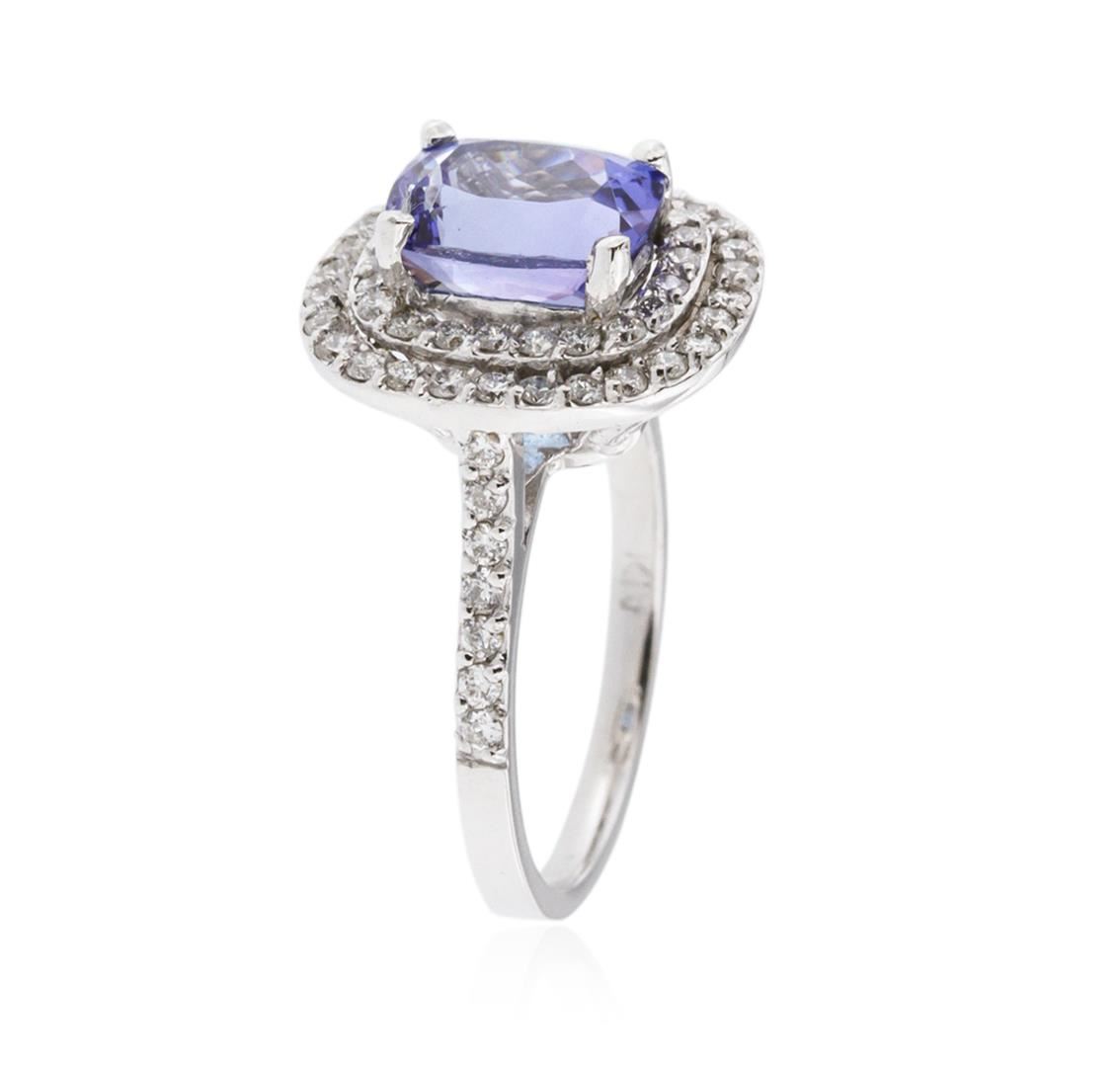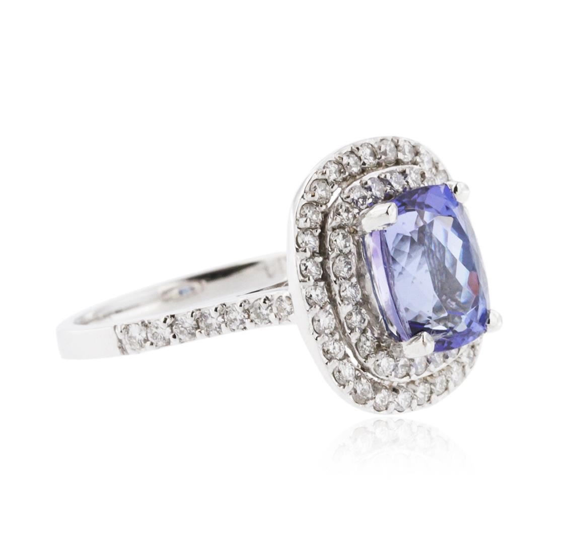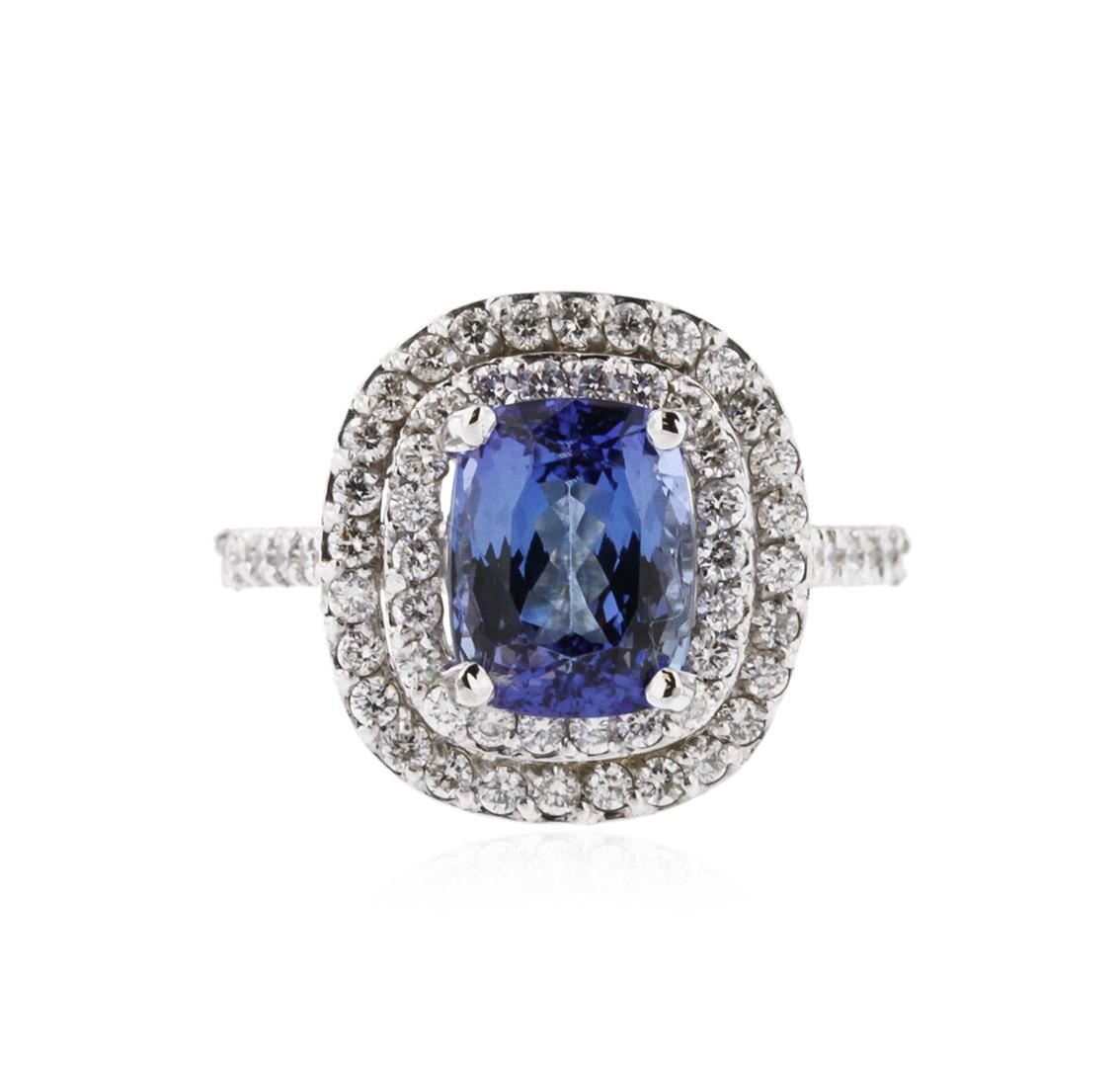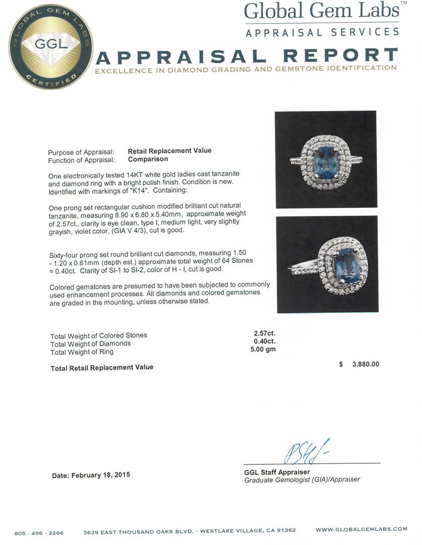 One electronically tested 14KT white gold ladies cast tanzanite and diamond ring with a bright polish finish. Identified with markings of "K14". Condition is new. Containing: One prong set rectangular cushion modified brilliant cut natural tanzanite, measuring 8.90 x 6.80 x 5.40mm, approximate weight of 2.57ct., clarity is eye clean, type I, medium light, very slightly grayish, violet color, (GIA V 4/3), cut is good. Sixty-Four prong set round brilliant cut diamonds, measuring 1.50 - 1.20 x 0.81mm (depth est.) approximate total weight of 64 Stones = 0.40ct. Clarity: SI-1 to SI-2. Color: H - I, Cut is Good. Colored gemstones are presumed to have been subjected to commonly used enhancement processes. All diamonds and colored gemstones are graded in the mounting, unless otherwise stated. Total Weight of Colored Stones 2.57ct. Total Weight of Diamonds 0.40ct. Total Weight of Ring 5.00 grams. GGL Appraised at $3,880.00.