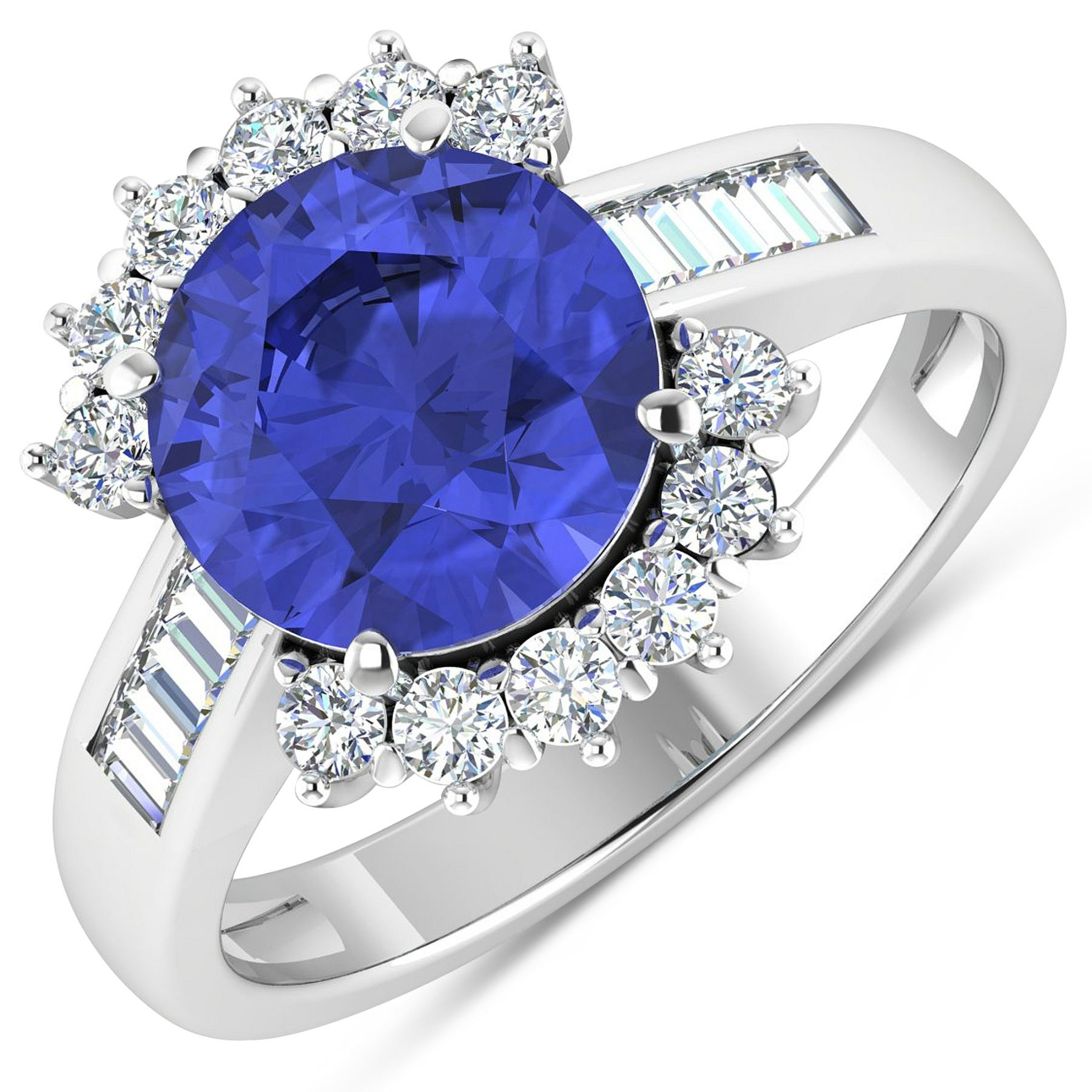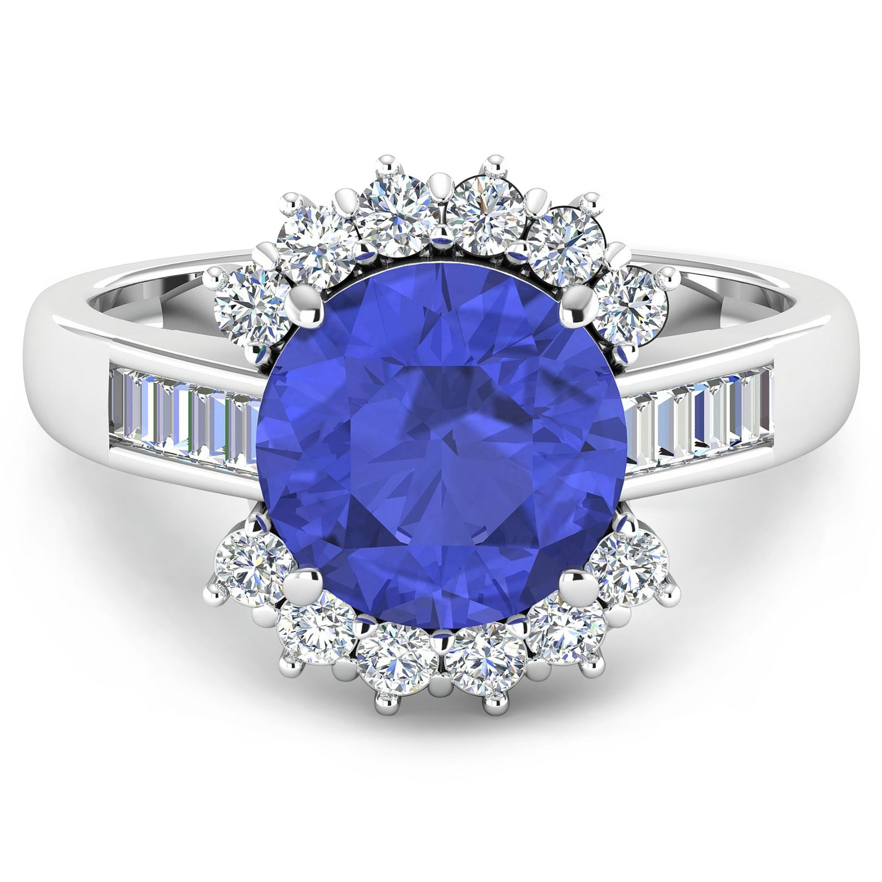 Tanzanite (AA+) Round 9.00mm - 1Pc + White Diamond Baguette 2.00x1.50mm - 8Pcs + White Diamond F/C Round 2.00mm - 12Pcs ( Diamond Quality : SI-2/HI ). Total weight of gemstone is 2.57cts. Total weight of Diamonds is 0.58cts. Total weight of this ring is 4.34 grams. Ring size 7.