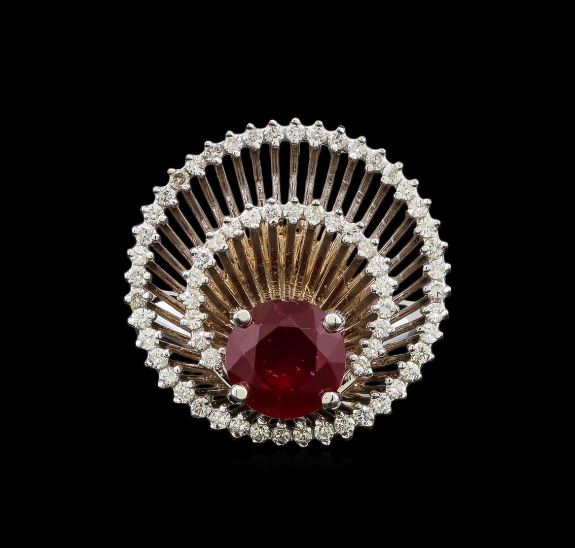 One electronically tested 14KT white gold ladies cast ruby and diamond ring with a bright polish finish. Identified with markings of "14K". Condition is new. Containing: One prong set round modified brilliant cut natural ruby, measuring 7.80 - 7.80 x 5.07 mm, approximate weight of 2.58ct., clarity is heavily included, medium, moderately strong, strongly purplish red color, (GIA stpR 5/4), cut is good. Sixty-Five prong set round brilliant cut diamonds, measuring 1.30 - 1.30 x 0.78mm (depth est.) approximate total weight of 65 Stones = 0.67ct. Clarity: SI-2 to I-1. Color: J - K, Cut is Good. Colored gemstones are presumed to have been subjected to commonly used enhancement processes. All diamonds and colored gemstones are graded in the mounting, unless otherwise stated. Total Weight of Colored Stones 2.58ct. Total Weight of Diamonds 0.67ct. Total Weight of Ring 8.50 grams. GGL Appraised at $3,025.00.