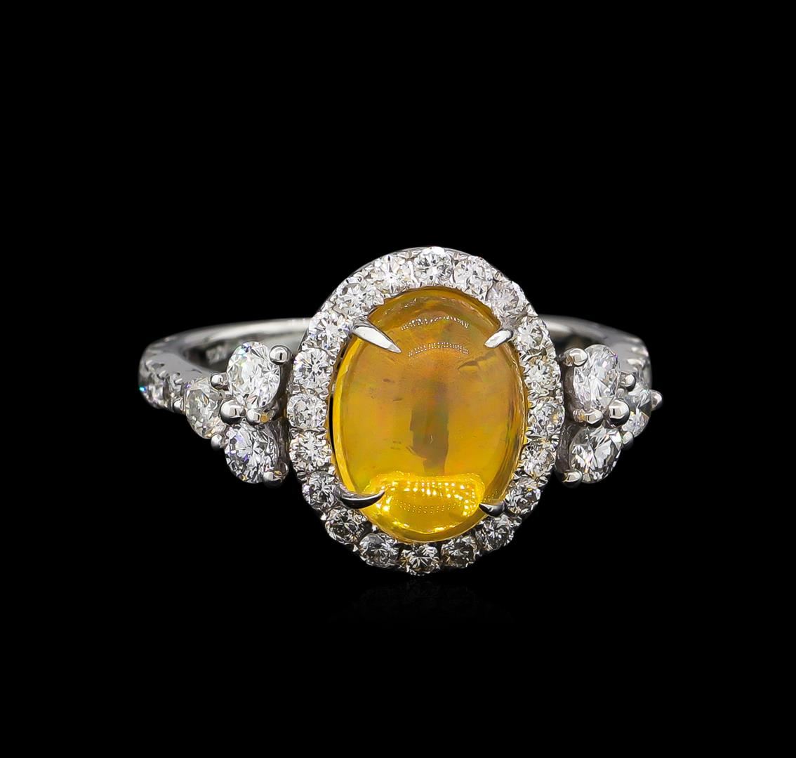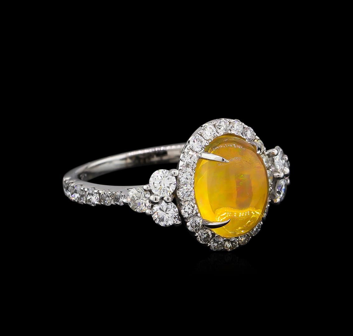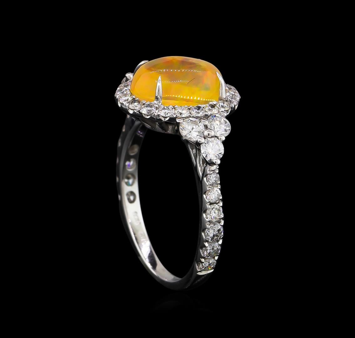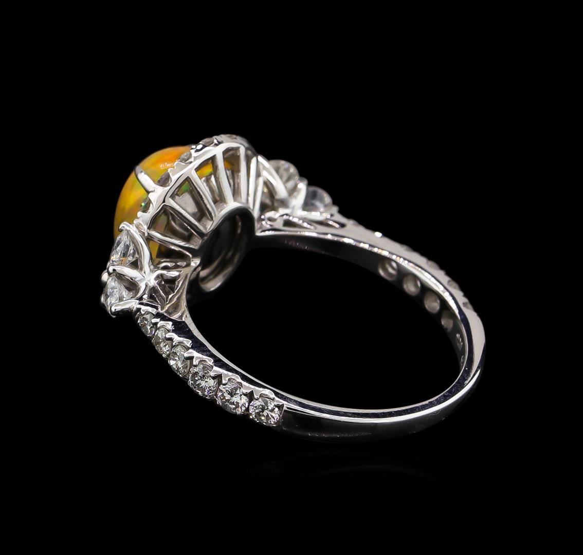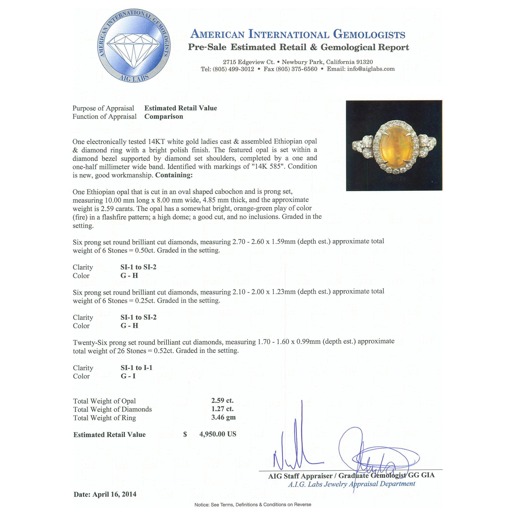 One electronically tested 14KT white gold ladies cast & assembled Ethiopian opal & diamond ring with a bright polish finish. Condition is new, good workmanship. The featured opal is set within a diamond bezel supported by diamond set shoulders, completed by a one and one-half millimeter wide band. Identified with markings of "14K 585". Containing: One crystal opal that is cut in a oval shaped cabochon and is prong set, measuring 10.00 mm long x 8.00 mm wide, and 4.85 mm thick and the approximate weight is 2.59 carats. The opal has a bright, orange-green play of color (fire) in a flashfire pattern; a high dome; a good cut; no inclusions; slight variation in base in its brightness and pattern; and is slightly directional. Graded in the setting. Six prong set round brilliant cut diamonds, measuring 2.70 - 2.60 x 1.59mm (depth est.) approximate. Total Weight of 6 Stones = 0.50ct. Graded in the setting. Clarity: SI-1 to SI-2. Color: G - H Six prong set round brilliant cut diamonds, measuring 2.10 - 2.00 x 1.23mm (depth est.) approximate. Total Weight of 6 Stones = 0.25ct. Graded in the setting. Clarity: SI-1 to SI-2. Color: G - H Twenty-Six prong set round brilliant cut diamonds, measuring 1.70 - 1.60 x 0.99mm (depth est.) approximate. Total Weight of 26 Stones = 0.52ct. Graded in the setting. Clarity: SI-1 to I-1. Color: G - I. Total Weight of Diamonds 1.27ct. Total Weight of Opals 2.59ct. Total Weight of Ring 3.46 grams. AIG Appraised at $4,950.00.