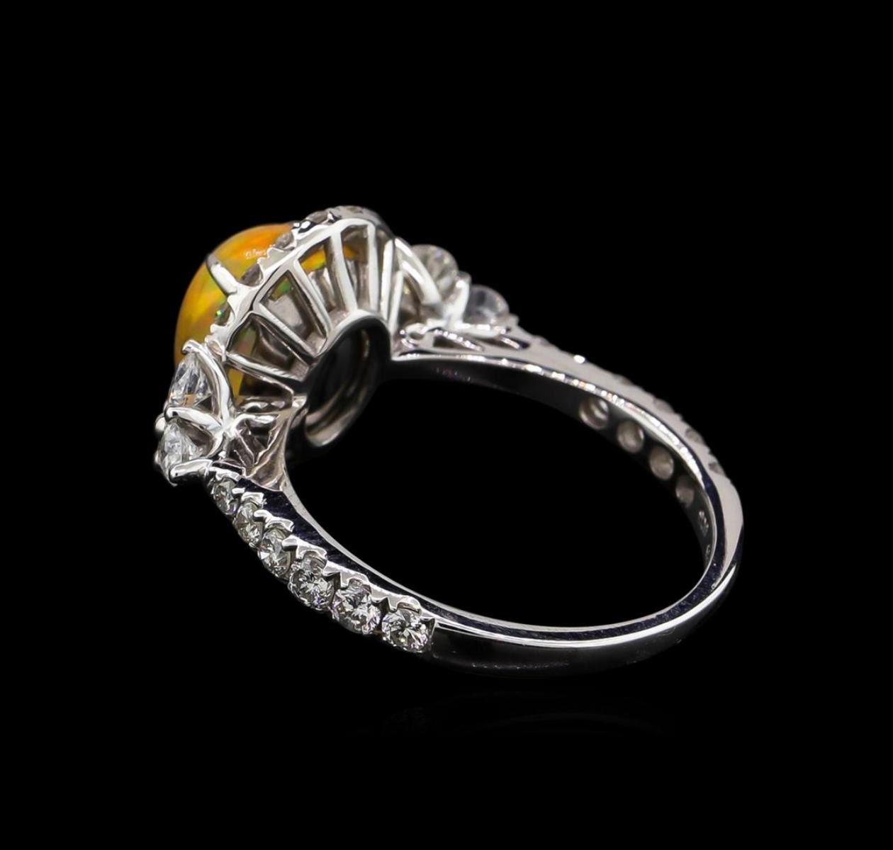 One electronically tested 14KT white gold ladies cast & assembled Ethiopian opal & diamond ring with a bright polish finish. Condition is new, good workmanship. The featured opal is set within a diamond bezel supported by diamond set shoulders, completed by a one and one-half millimeter wide band. Identified with markings of "14K 585". Containing: One crystal opal that is cut in a oval shaped cabochon and is prong set, measuring 10.00 mm long x 8.00 mm wide, and 4.85 mm thick and the approximate weight is 2.59 carats. The opal has a bright, orange-green play of color (fire) in a flashfire pattern; a high dome; a good cut; no inclusions; slight variation in base in its brightness and pattern; and is slightly directional. Graded in the setting. Six prong set round brilliant cut diamonds, measuring 2.70 - 2.60 x 1.59mm (depth est.) approximate. Total Weight of 6 Stones = 0.50 ct. Graded in the setting. Clarity: SI-1 to SI-2. Color: G - H Six prong set round brilliant cut diamonds, measuring 2.10 - 2.00 x 1.23mm (depth est.) approximate. Total Weight of 6 Stones = 0.25ct. Graded in the setting. Clarity: SI-1 to SI-2. Color: G - H Twenty-Six prong set round brilliant cut diamonds, measuring 1.70 - 1.60 x 0.99mm (depth est.) approximate. Total Weight of 26 Stones = 0.52ct. Graded in the setting. Clarity: SI-1 to I-1. Color: G - I. Total Weight of Diamonds 1.27ct. Total Weight of Opals 2.59ct. Total Weight of Ring 3.46 grams. AIG Appraised.