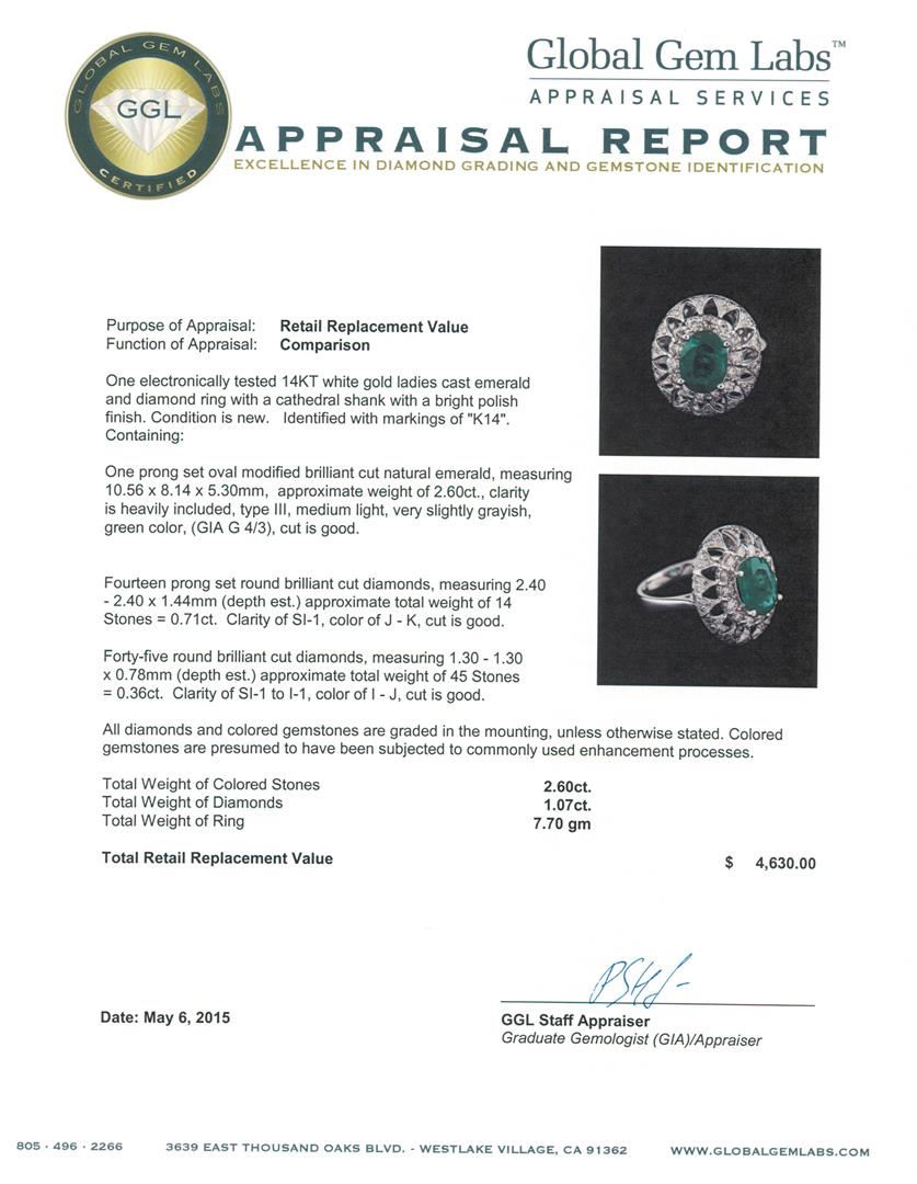 One electronically tested 14KT white gold ladies cast emerald and diamond ring with a cathedral shank with a bright polish finish. Identified with markings of "K14". Condition is new. Containing: One prong set oval modified brilliant cut natural emerald, measuring 10.56 x 8.14 x 5.30mm, approximate weight of 2.60ct., clarity is heavily included, type III, medium light, very slightly grayish, green color, (GIA G 4/3), cut is good. Fourteen prong set round brilliant cut diamonds, measuring 2.40 - 2.40 x 1.44mm (depth est.) approximate total weight of 14 Stones = 0.71ct. Clarity: SI-1. Color: J - K, Cut is Good. Forty-Five round brilliant cut diamonds, measuring 1.30 - 1.30 x 0.78mm (depth est.) approximate total weight of 45 Stones = 0.36ct. Clarity: SI-1 to I-1. Color: I - J, Cut is Good. All diamonds and colored gemstones are graded in the mounting, unless otherwise stated. Colored gemstones are presumed to have been subjected to commonly used enhancement processes.. Total Weight of Colored Stones 2.60ct. Total Weight of Diamonds 1.07ct. Total Weight of Ring 7.70 grams. GGL Appraised at $4,630.00.