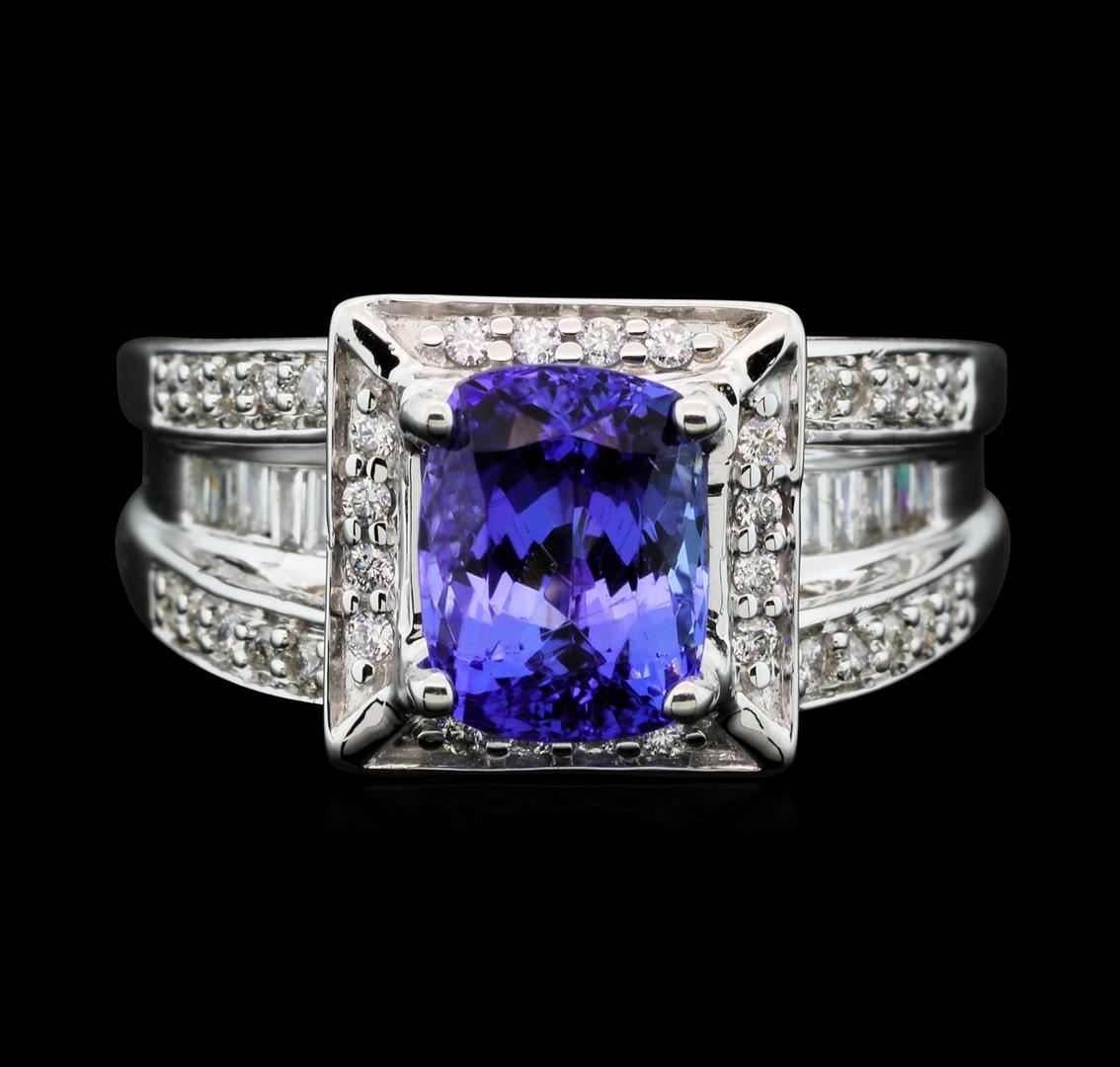 One electronically tested 14KT white gold lady's cast fashion ring with a cathedral split shank with a halo with a bright polish finish. The featured lady's ring has a shank measuring 3.17 millimeters wide. Identified with markings of "14K". Condition is new, good workmanship. Containing: One prong set rectangular cushion modified brilliant cut natural tanzanite, measuring 8.60 x 6.59 x 5.53mm, (depth est.) approximate weight of 2.60ct., clarity is slightly included, medium, moderately strong, violetish blue color, (GIA vB 5/4), cut is very good. Transmitting light with a minimum of distortion, transparent. Colored gemstones are presumed to have been subjected to commonly used enhancement processes. Graded in the setting.Fifteen channel set baguette cut diamonds, measuring from 1.75 x 1.00 x 0.85mm (depth est.) to 2.30 x 1.25 x 1.06mm (depth est.) approximate total weight of 15 Stones = 0.30ct. Graded in the setting. Clarity: SI-1 to SI-3. Color: H - ICut Good Thirty-Six prong set round brilliant cut diamonds, measuring 1.40 - 1.20 x 0.81mm (depth est.) approximate total weight of 36 Stones = 0.30ct. Graded in the setting. Clarity: SI-1 to SI-3. Color: H - ICut Good. Total Weight of Colored Stones 2.60ct. Total Weight of Diamonds 0.60ct. Total Weight of Ring 7.20gm. GAS Appraised.
