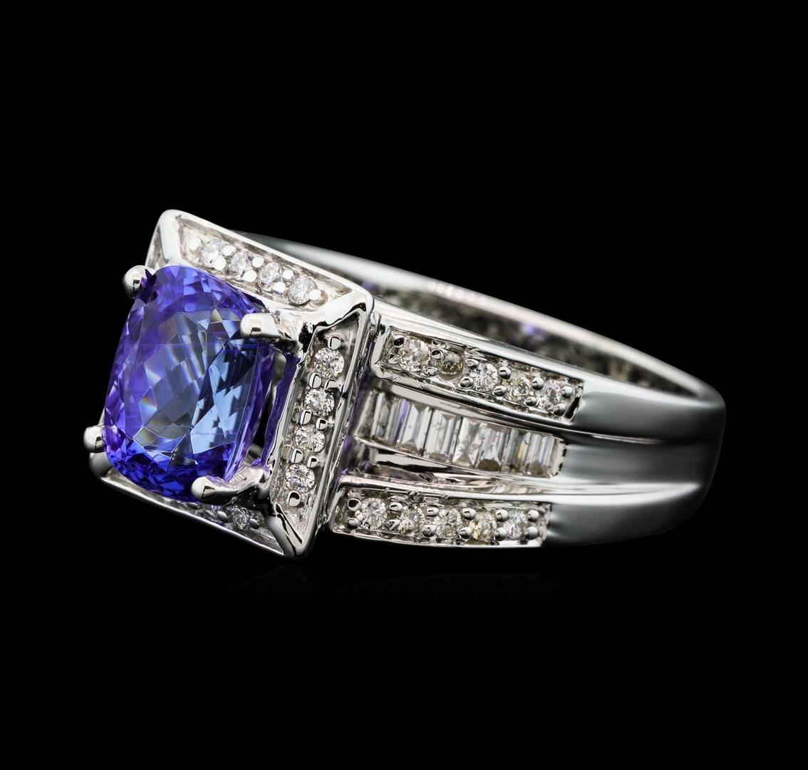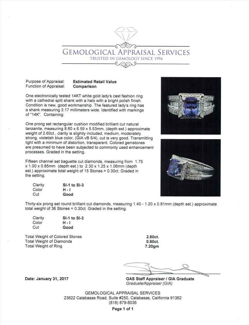 One electronically tested 14KT white gold lady's cast fashion ring with a cathedral split shank with a halo with a bright polish finish. The featured lady's ring has a shank measuring 3.17 millimeters wide. Identified with markings of "14K". Condition is new, good workmanship. Containing: One prong set rectangular cushion modified brilliant cut natural tanzanite, measuring 8.60 x 6.59 x 5.53mm, (depth est.) approximate weight of 2.60ct., clarity is slightly included, medium, moderately strong, violetish blue color, (GIA vB 5/4), cut is very good. Transmitting light with a minimum of distortion, transparent. Colored gemstones are presumed to have been subjected to commonly used enhancement processes. Graded in the setting.Fifteen channel set baguette cut diamonds, measuring from 1.75 x 1.00 x 0.85mm (depth est.) to 2.30 x 1.25 x 1.06mm (depth est.) approximate total weight of 15 Stones = 0.30ct. Graded in the setting. Clarity: SI-1 to SI-3. Color: H - ICut Good Thirty-Six prong set round brilliant cut diamonds, measuring 1.40 - 1.20 x 0.81mm (depth est.) approximate total weight of 36 Stones = 0.30ct. Graded in the setting. Clarity: SI-1 to SI-3. Color: H - ICut Good. Total Weight of Colored Stones 2.60ct. Total Weight of Diamonds 0.60ct. Total Weight of Ring 7.20gm. GAS Appraised.