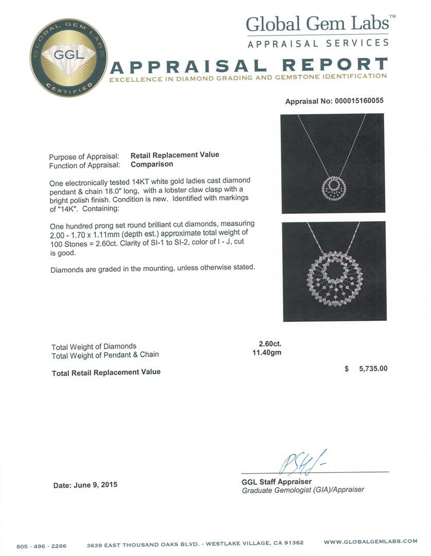 One electronically tested 14KT white gold ladies cast diamond pendant & chain 18.0" long, with a lobster claw clasp with a bright polish finish. Identified with markings of "14K". Condition is new. Containing: One Hundred prong set round brilliant cut diamonds, measuring 2.00 - 1.70 x 1.11mm (depth est.) approximate total weight of 100 Stones = 2.60ct. Clarity: SI-1 to SI-2. Color: I - J, Cut is Good. Diamonds are graded in the mounting, unless otherwise stated. Total Weight of Diamonds 2.60ct. Total Weight of Pendant & Chain 11.40 grams. GGL Appraised at $5,735.00.