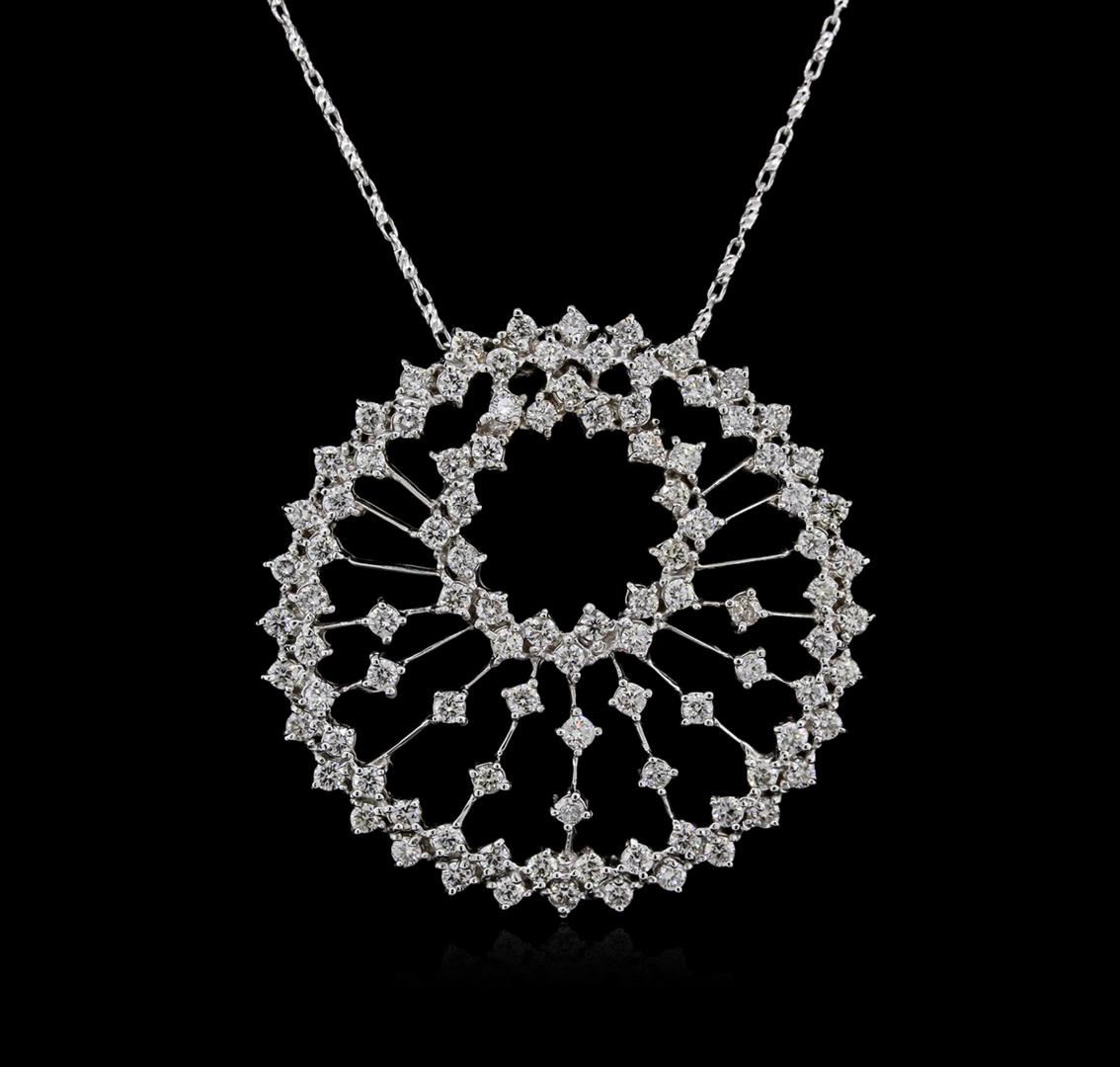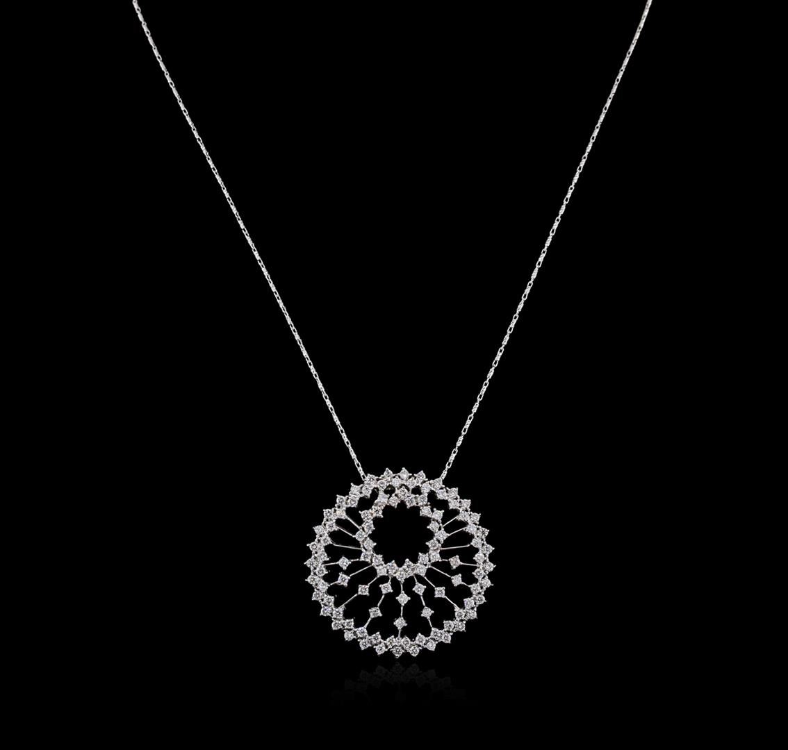One electronically tested 14KT white gold ladies cast diamond pendant & chain 18.0" long, with a lobster claw clasp with a bright polish finish. Identified with markings of "14K". Condition is new. Containing: One Hundred prong set round brilliant cut diamonds, measuring 2.00 - 1.70 x 1.11mm (depth est.) approximate total weight of 100 Stones = 2.60ct. Clarity: SI-1 to SI-2. Color: I - J, Cut is Good. Diamonds are graded in the mounting, unless otherwise stated. Total Weight of Diamonds 2.60ct. Total Weight of Pendant & Chain 11.40 grams. GGL Appraised at $5,735.00.