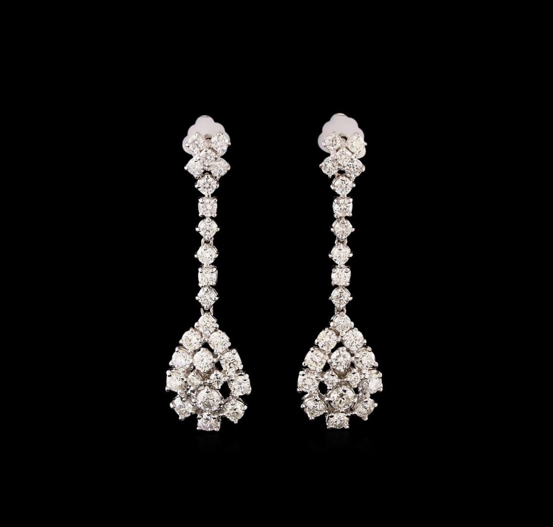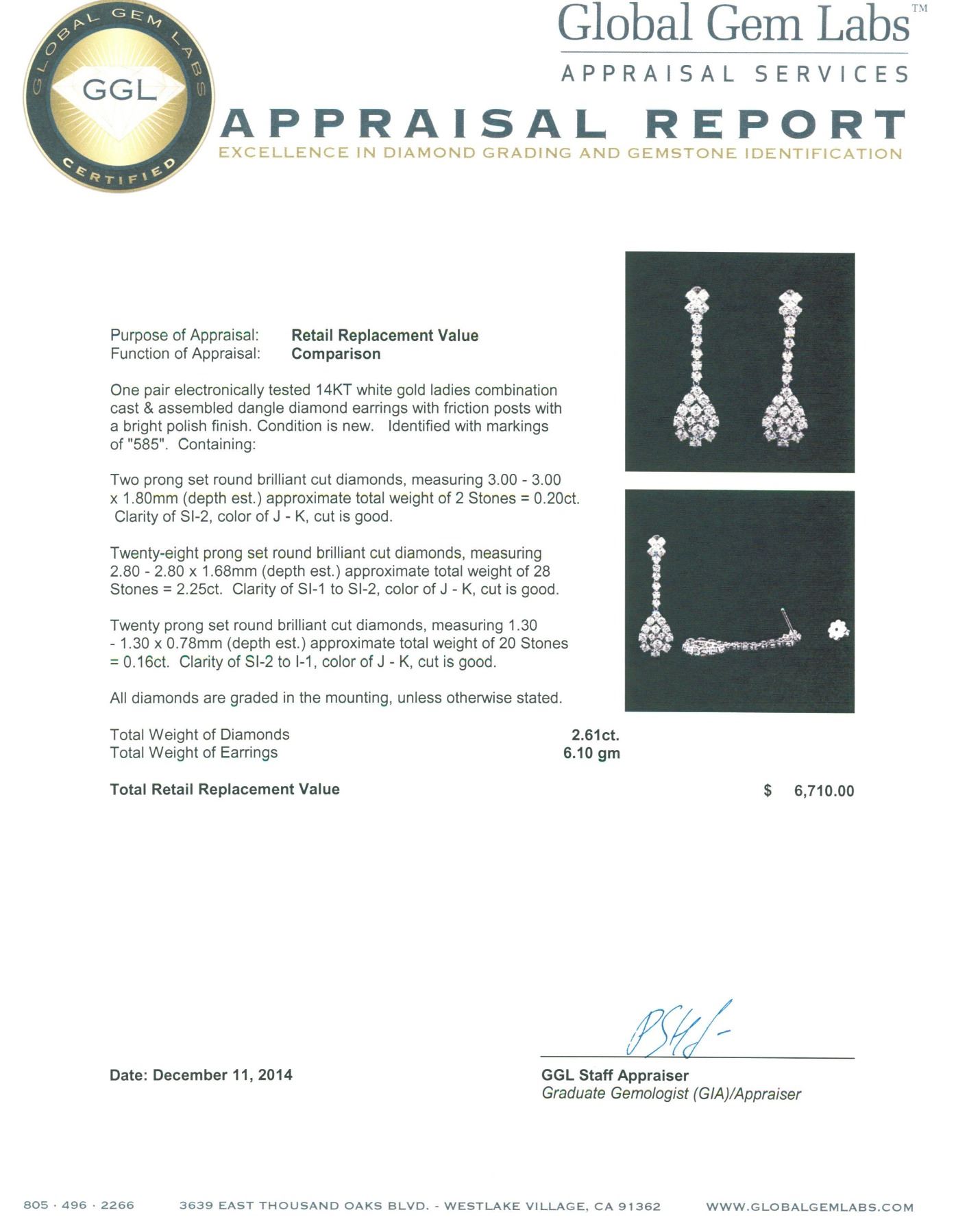 One pair electronically tested 14KT white gold ladies combination cast & assembled dangle diamond earrings with friction posts with a bright polish finish. Identified with markings of "585". Condition is new. Containing: Two prong set round brilliant cut diamonds, measuring 3.00 - 3.00 x 1.80mm (depth est.) approximate total weight of 2 Stones = 0.20 ct. Clarity: SI-2. Color: J - K, Cut is Good. Twenty-Eight prong set round brilliant cut diamonds, measuring 2.80 - 2.80 x 1.68mm (depth est.) approximate total weight of 28 Stones = 2.25ct. Clarity: SI-1 to SI-2. Color: J - K, Cut is Good. Twenty prong set round brilliant cut diamonds, measuring 1.30 - 1.30 x 0.78mm (depth est.) approximate total weight of 20 Stones = 0.16ct. Clarity: SI-2 to I-1. Color: J - K, Cut is Good. All diamonds are graded in the mounting, unless otherwise stated. Total Weight of Diamonds 2.61ct. Total Weight of Earrings 6.10 grams. GGL Appraised.