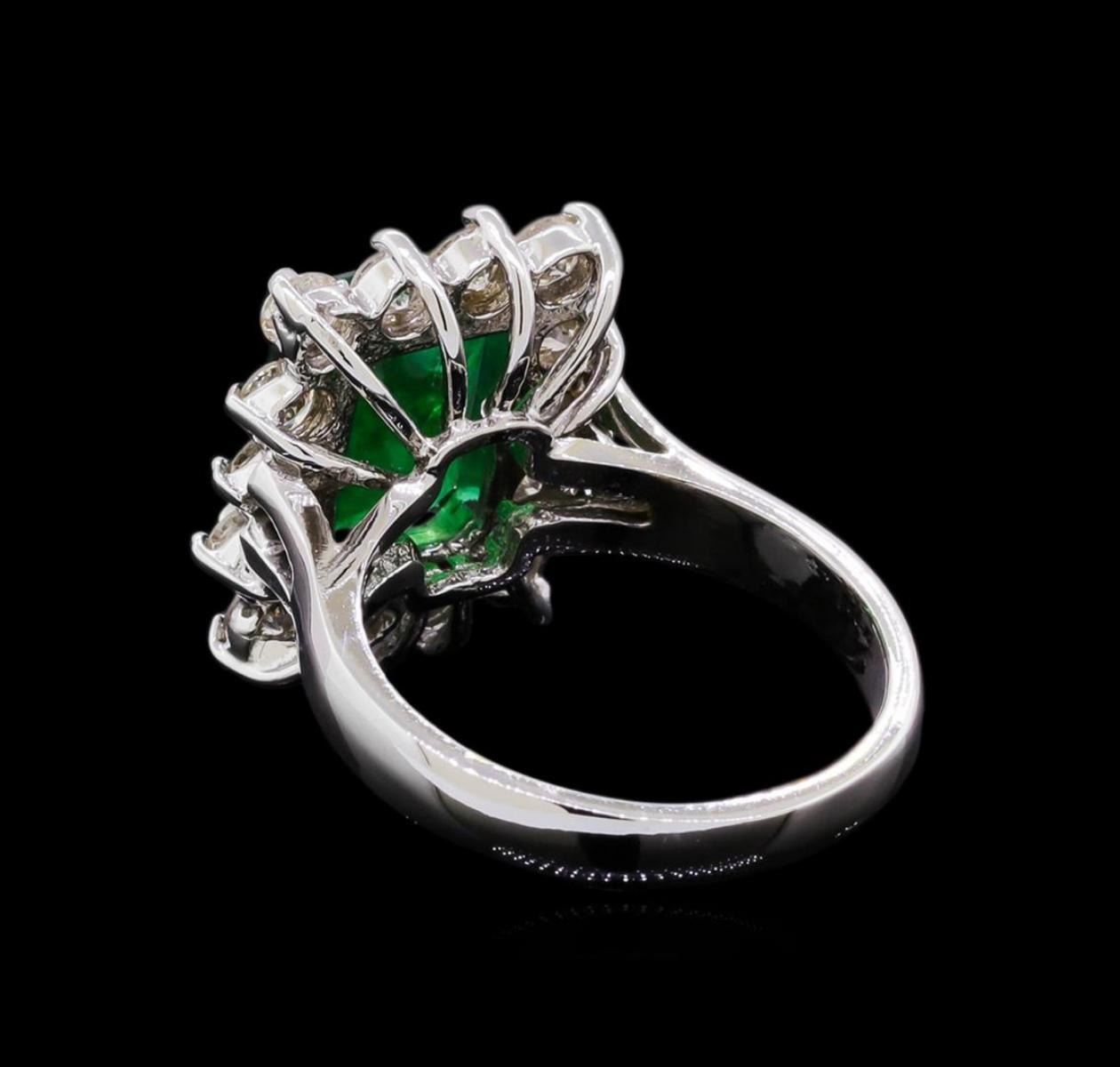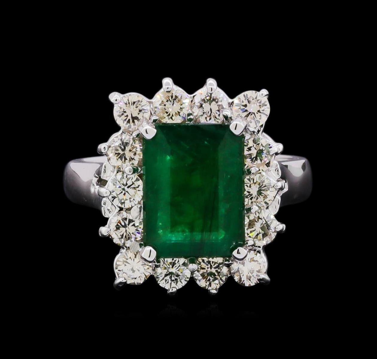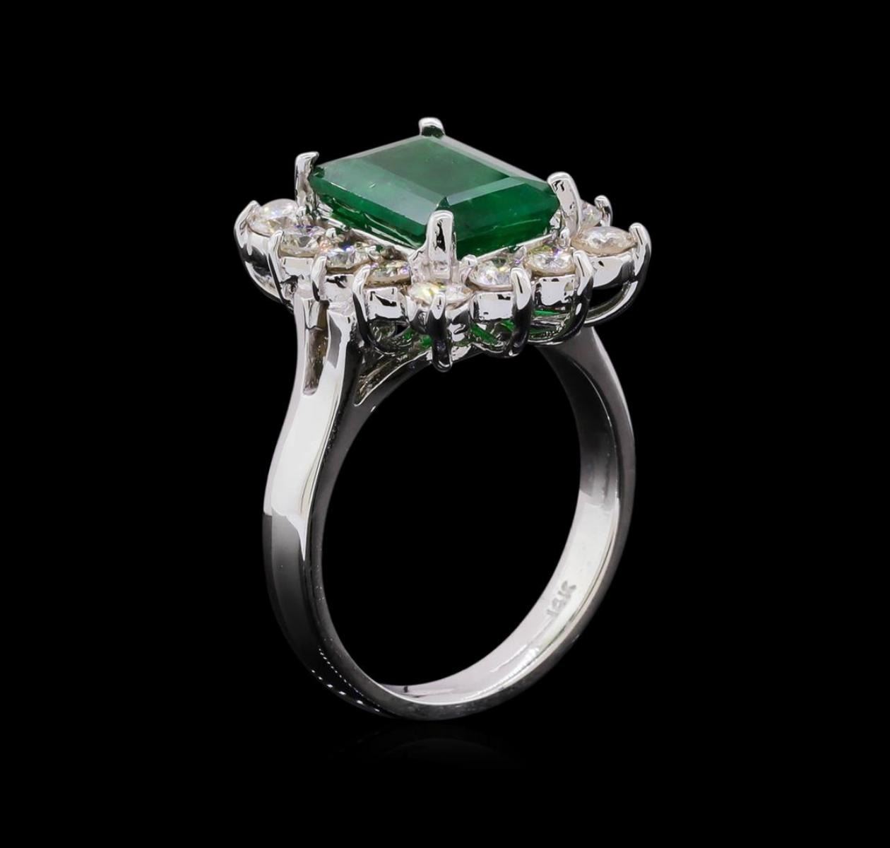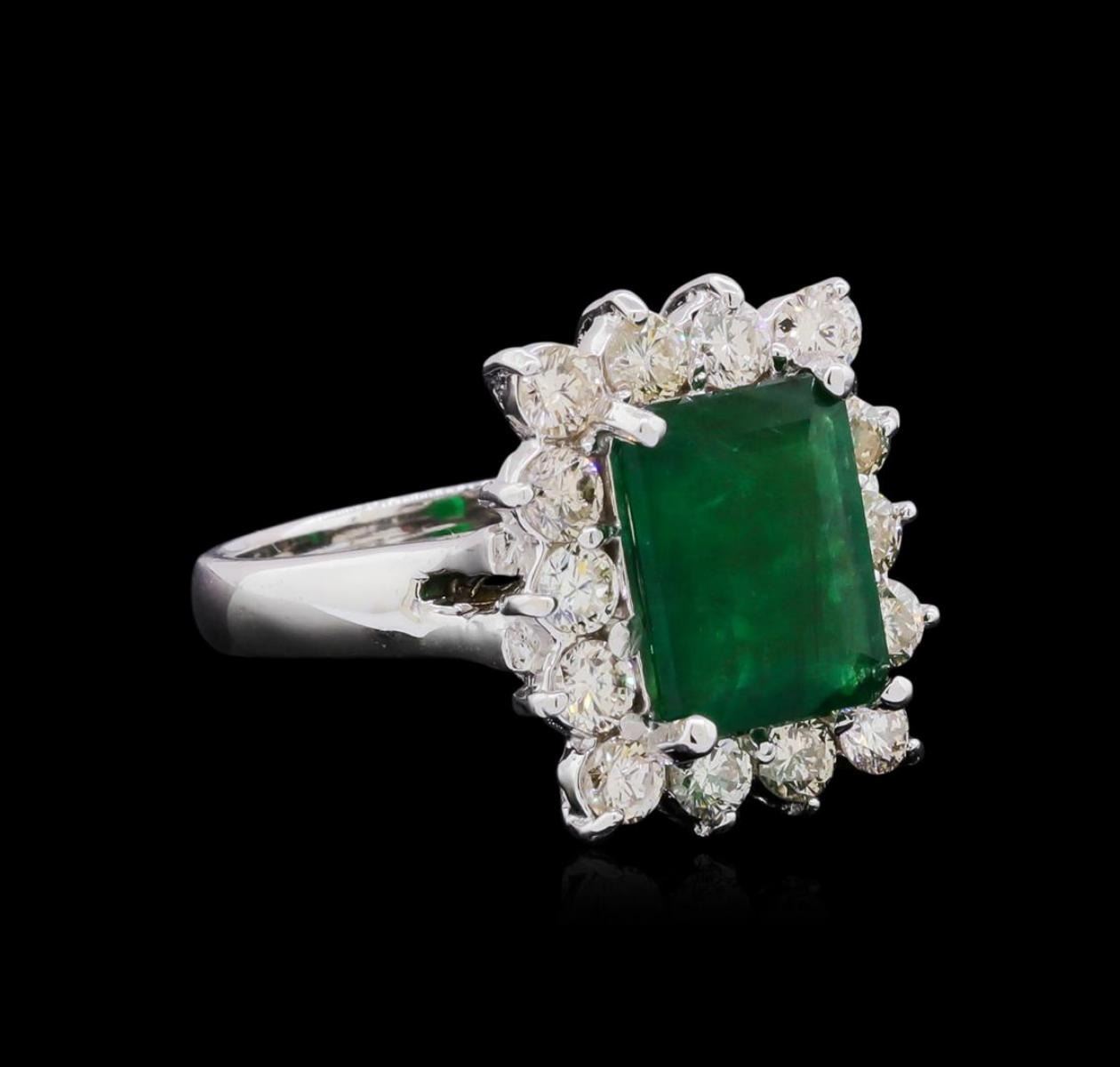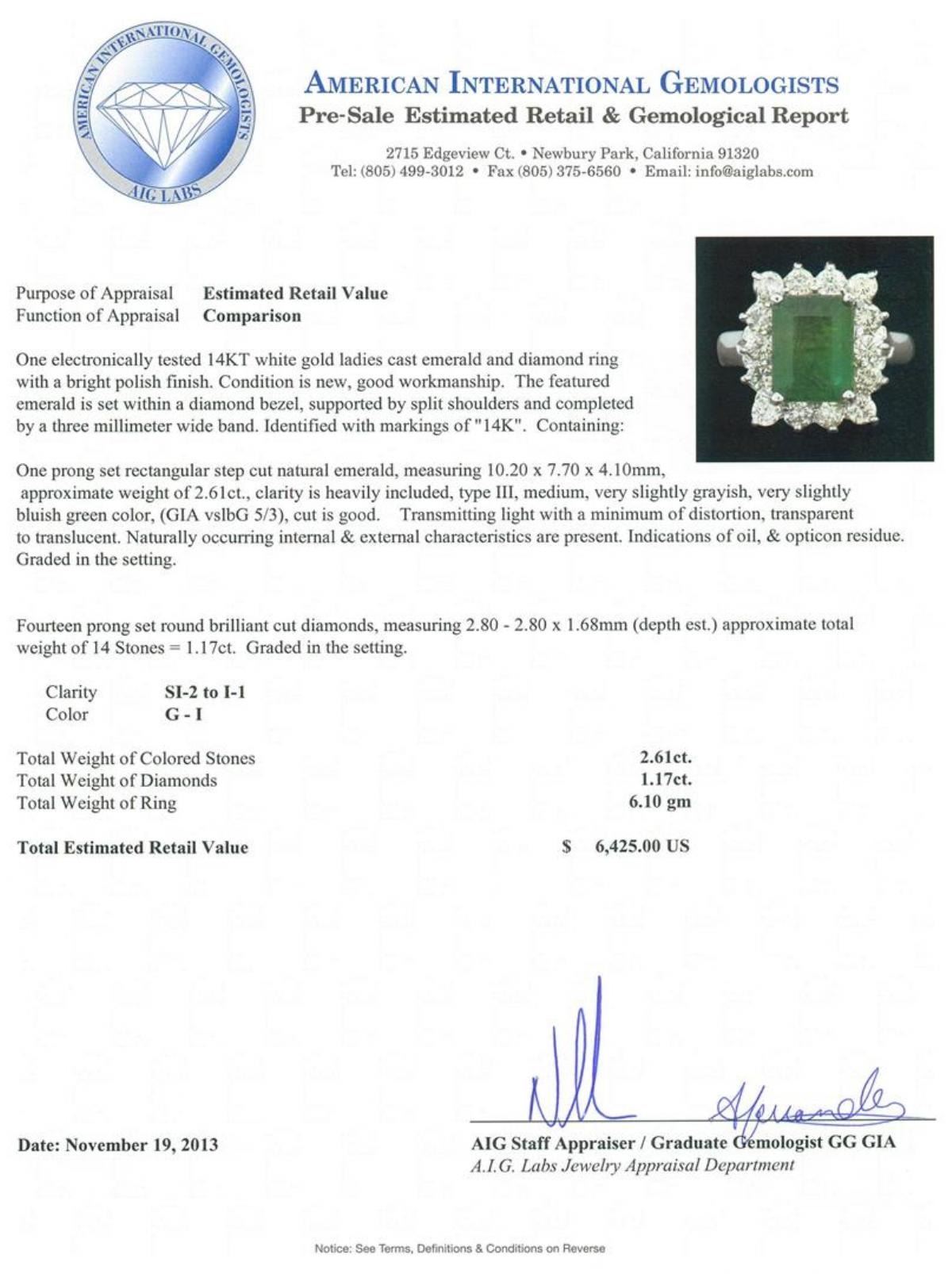 One electronically tested 14KT white gold ladies cast emerald and diamond ring with a bright polish finish. Condition is new, good workmanship. The featured emerald is set within a diamond bezel, supported by split shoulders and completed by a three millimeter wide band. Identified with markings of "14K". Containing: One prong set rectangular step cut natural emerald, measuring 10.20 x 7.70 x 4.10mm, approximate weight of 2.61ct., clarity is heavily included, type III, medium, very slightly grayish, very slightly bluish green color, (GIA vslbG 5/3), cut is good. Transmitting light with a minimum of distortion, transparent to translucent. Naturally occurring internal & external characteristics are present. Indications of oil, & opticon residue. Graded in the setting. Fourteen prong set round brilliant cut diamonds, measuring 2.80 - 2.80 x 1.68mm (depth est.) approximate total weight of 14 Stones = 1.17ct. Graded in the setting. Clarity SI-2 to I-1. Color G -- I. Total Weight of Colored Stones 2.61ct. Total Weight of Diamonds 1.17ct. Total Weight of Ring 6.10gm. AIG Appraised.