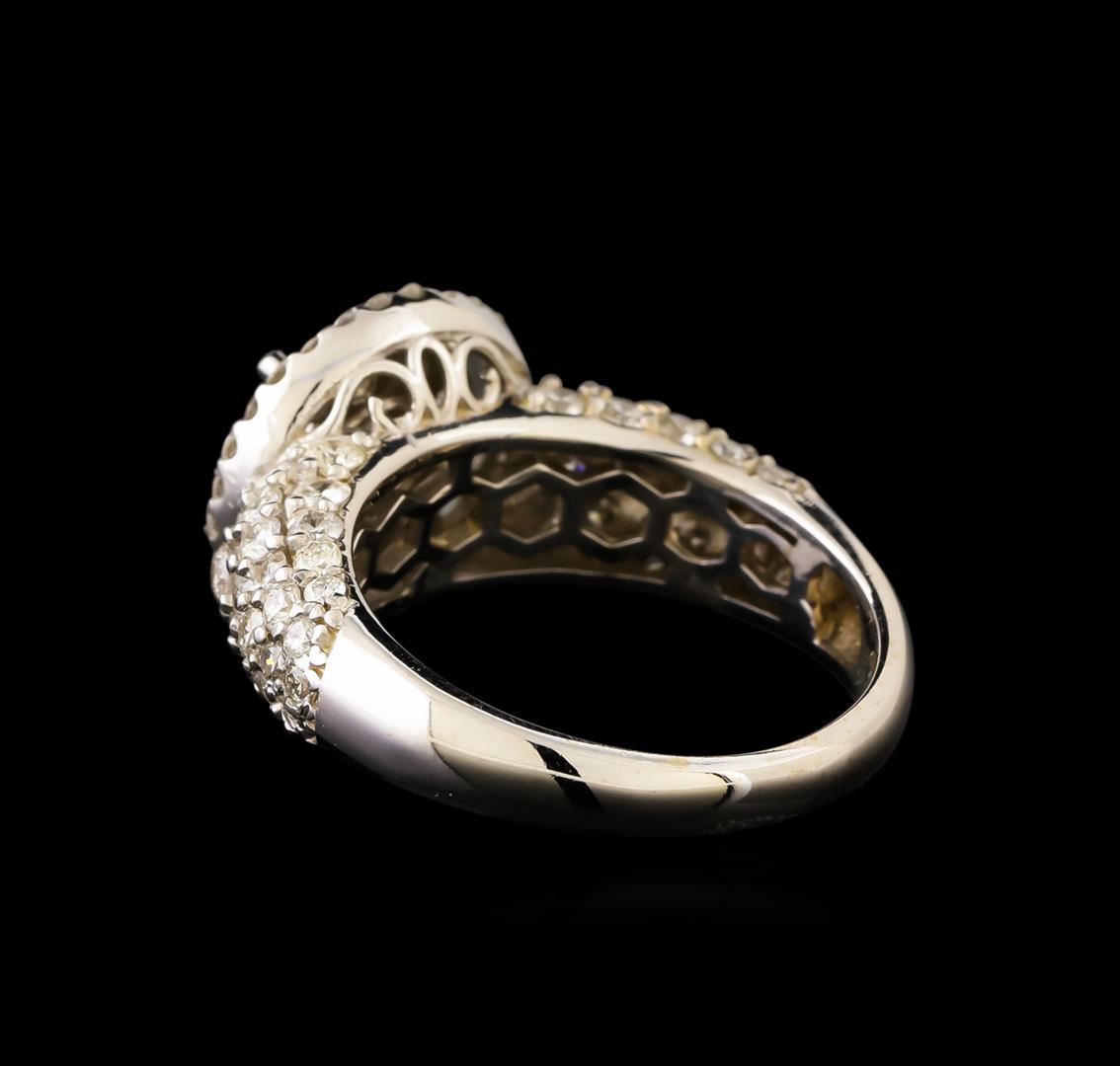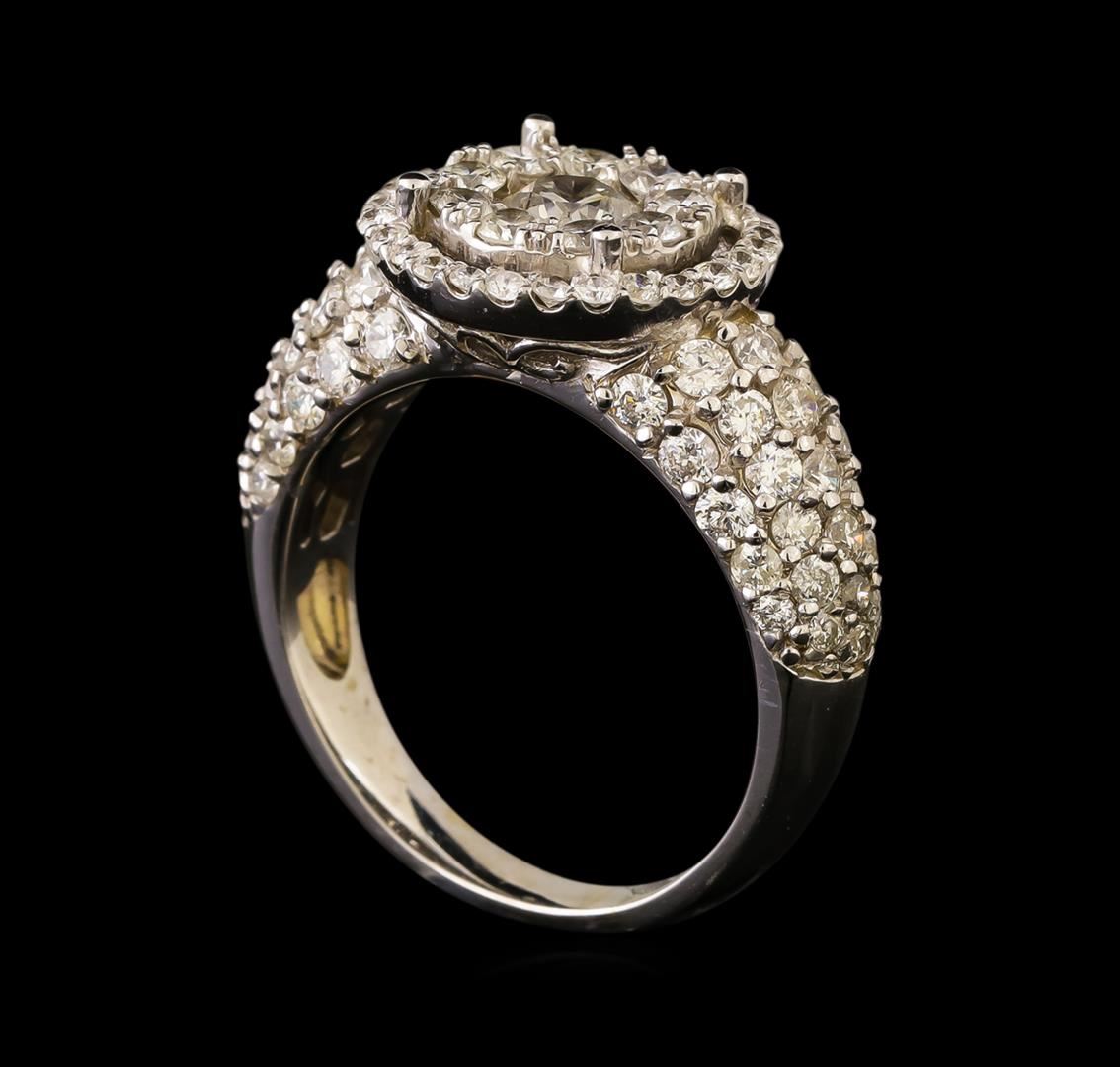 One electronically tested 14KT white gold ladies cast diamond ring with a bright polish finish. The ring features an organized diamond cluster set within a diamond bezel supported by diamond set shoulders, completed by a three millimeter wide band. Identified with markings of "14K". Condition is new, good workmanship. Containing: One prong set round brilliant cut diamond, measuring 4.80 - 4.70 x 3.04mm (depth est.) approximate weight of 0.42ct. Graded in the setting. Clarity: I-1. Color: H Sixty-Five prong set round brilliant cut diamonds, measuring 2.00 - 1.90 x 1.17mm (depth est.) approximate total weight of 65 Stones = 1.86ct. Graded in the setting. Clarity: SI-1 to I-1. Color: G - I Twenty-Seven prong set round brilliant cut diamonds, measuring 1.40 - 1.30 x 0.81mm (depth est.) approximate total weight of 27 Stones = 0.34ct. Graded in the setting. Clarity: SI-1 to I-1. Color: G - I. Total Weight of Diamonds 2.62ct. Total Weight of Ring 6.38 grams. AIG Appraised.