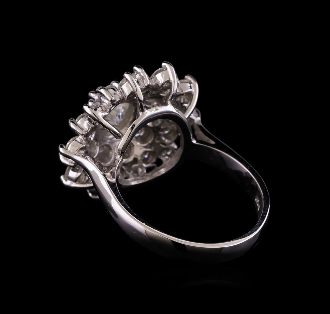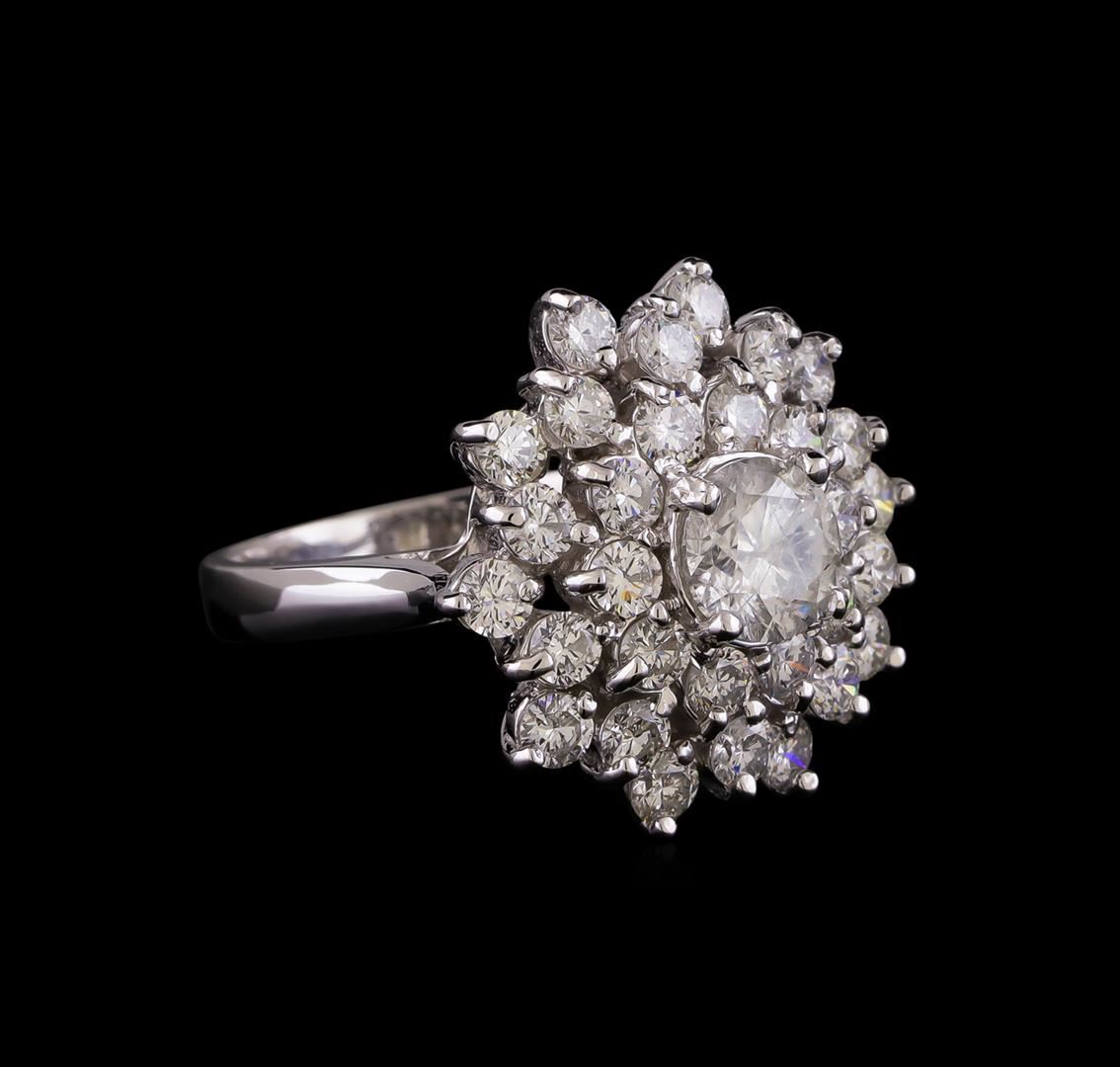 One electronically tested 14KT white gold ladies combination cast & assembled engagement ring with a flat shank with a bright polish finish. Identified with markings of "K14". Condition is new. Containing: One prong set round brilliant cut diamond, measuring 6.20 - 6.10 x 4.00mm (depth est.) approximate weight of 0.92ct. Clarity: I-2. Color: I, Cut is Good. Thirty prong set round brilliant cut diamonds, measuring 2.50 - 2.50 x 1.50mm (depth est.) approximate total weight of 30 Stones = 1.71ct. Clarity: SI-2 to I-1. Color: I - J, Cut is Good. All diamonds are graded in the mounting, unless otherwise stated. Total Weight of Diamonds 2.64ct. Total Weight of Ring 6.50 grams. GGL Appraised at $12,390.00.