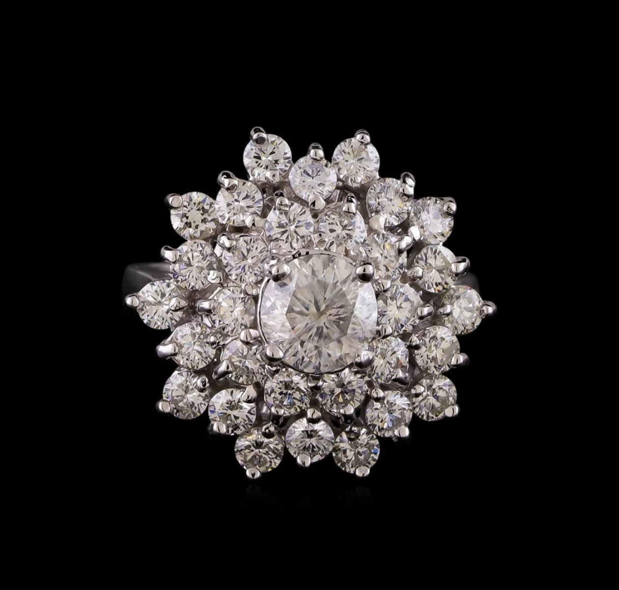 One electronically tested 14KT white gold ladies combination cast & assembled engagement ring with a flat shank with a bright polish finish. Identified with markings of "K14". Condition is new. Containing: One prong set round brilliant cut diamond, measuring 6.20 - 6.10 x 4.00mm (depth est.) approximate weight of 0.92ct. Clarity: I-2. Color: I, Cut is Good. Thirty prong set round brilliant cut diamonds, measuring 2.50 - 2.50 x 1.50mm (depth est.) approximate total weight of 30 Stones = 1.71ct. Clarity: SI-2 to I-1. Color: I - J, Cut is Good. All diamonds are graded in the mounting, unless otherwise stated. Total Weight of Diamonds 2.64ct. Total Weight of Ring 6.50 grams. GGL Appraised.